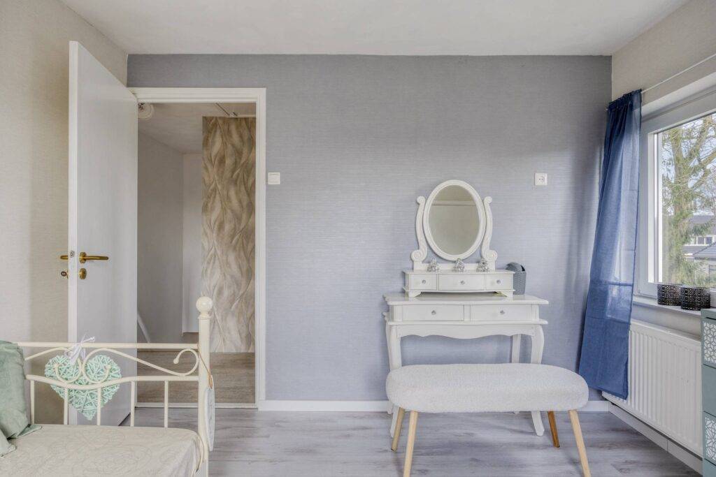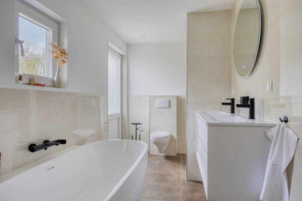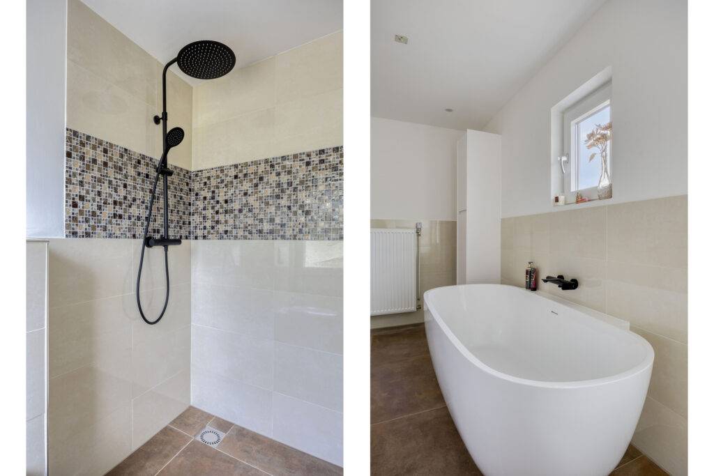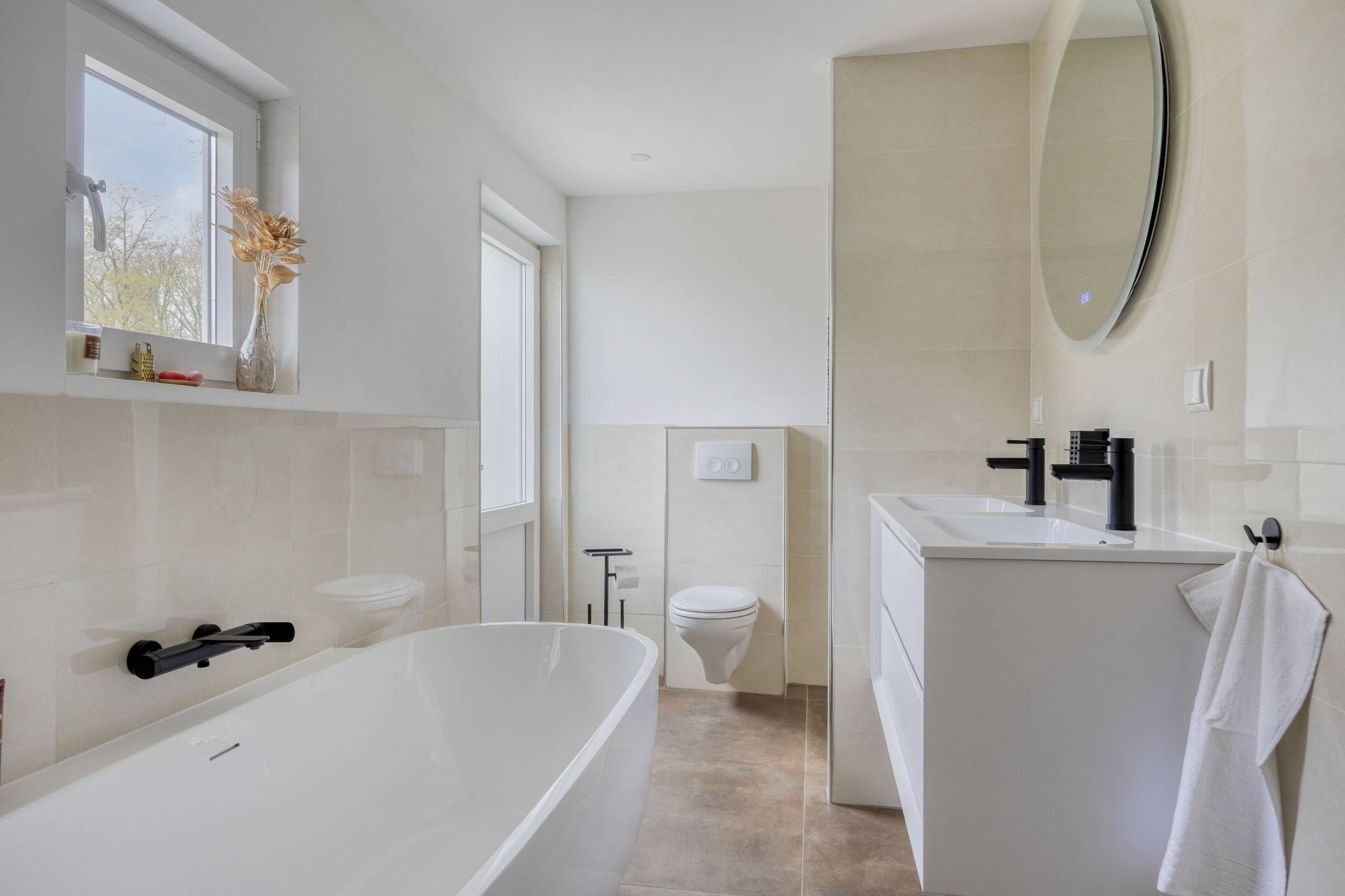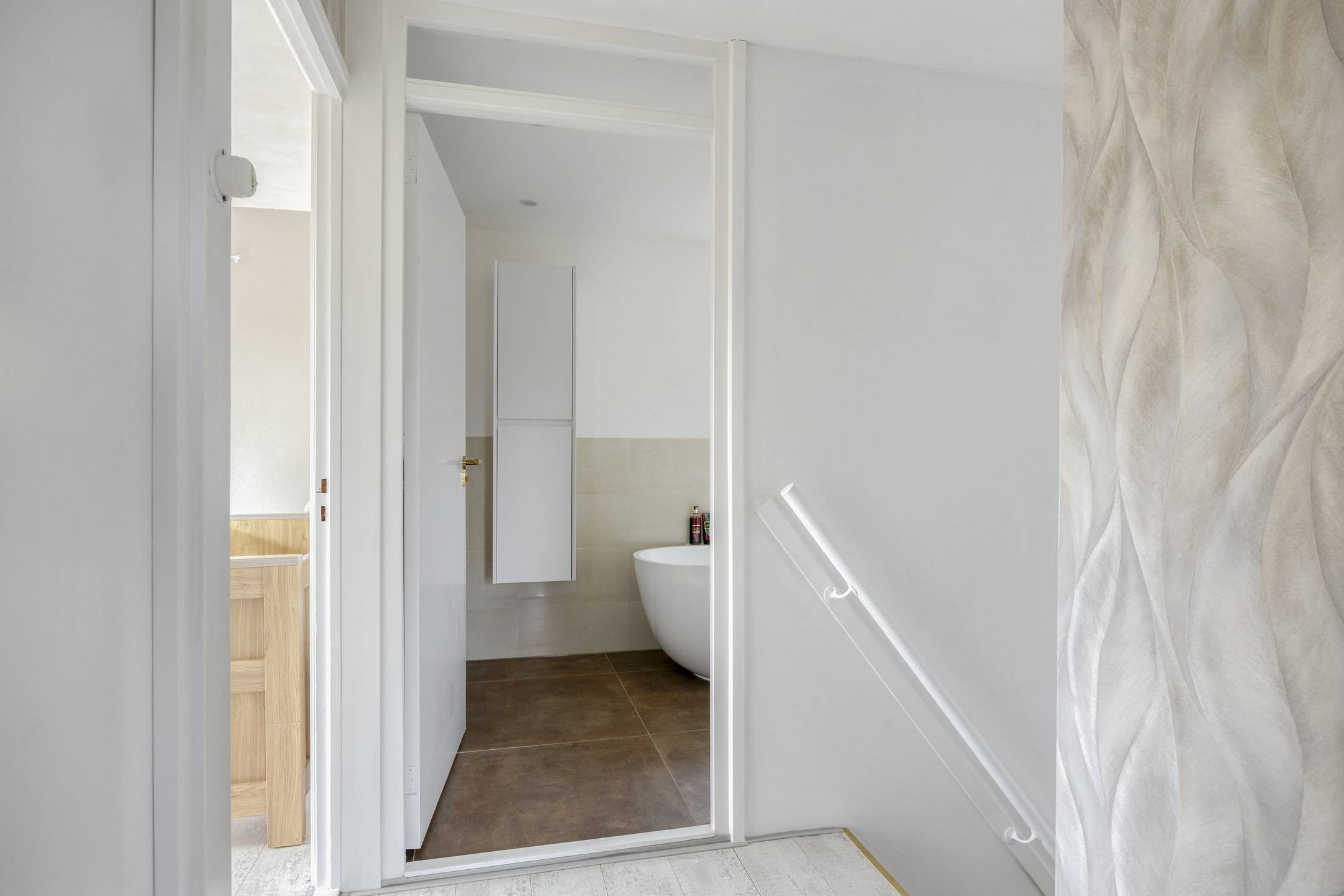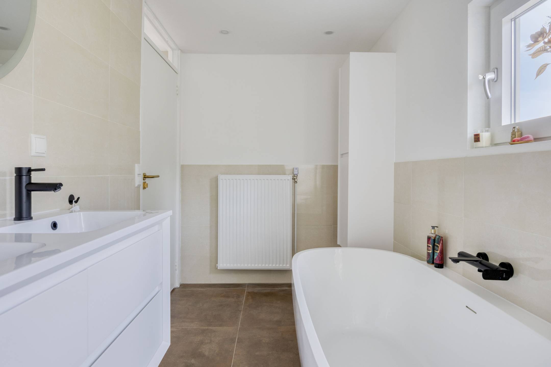 Verdieping: overloop, drie slaapkamers (waarvan twee met inbouwkasten) en een in 2026 vernieuwde badkamer voorzien van een ligbad, inloopdouche, wastafelmeubel met twee wastafels, 2e toilet (wandcloset) en kast.