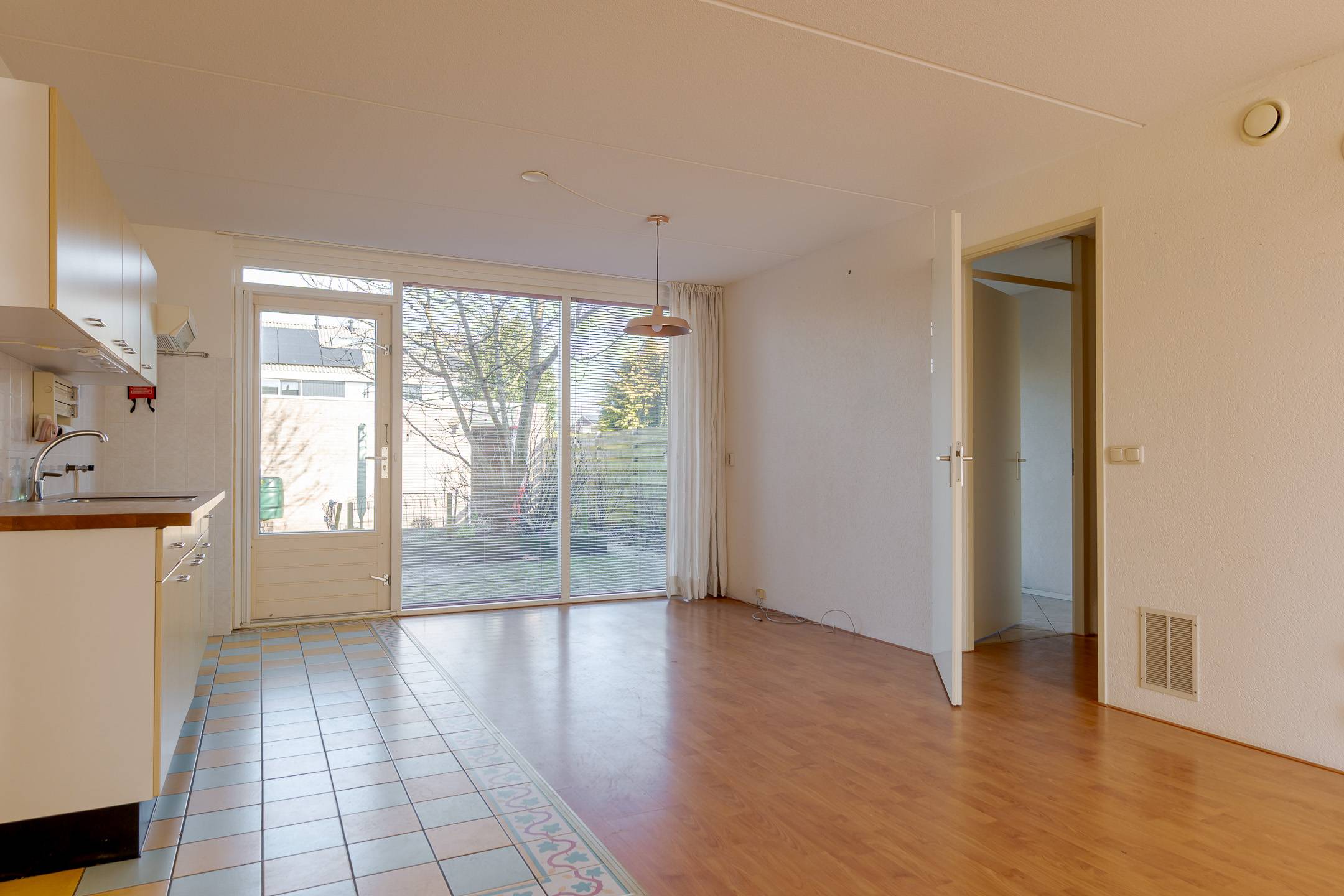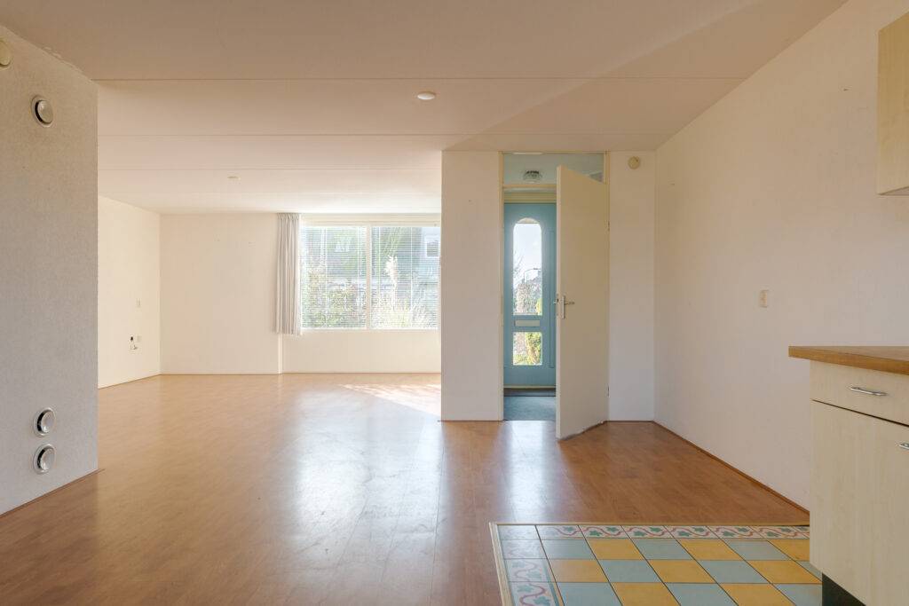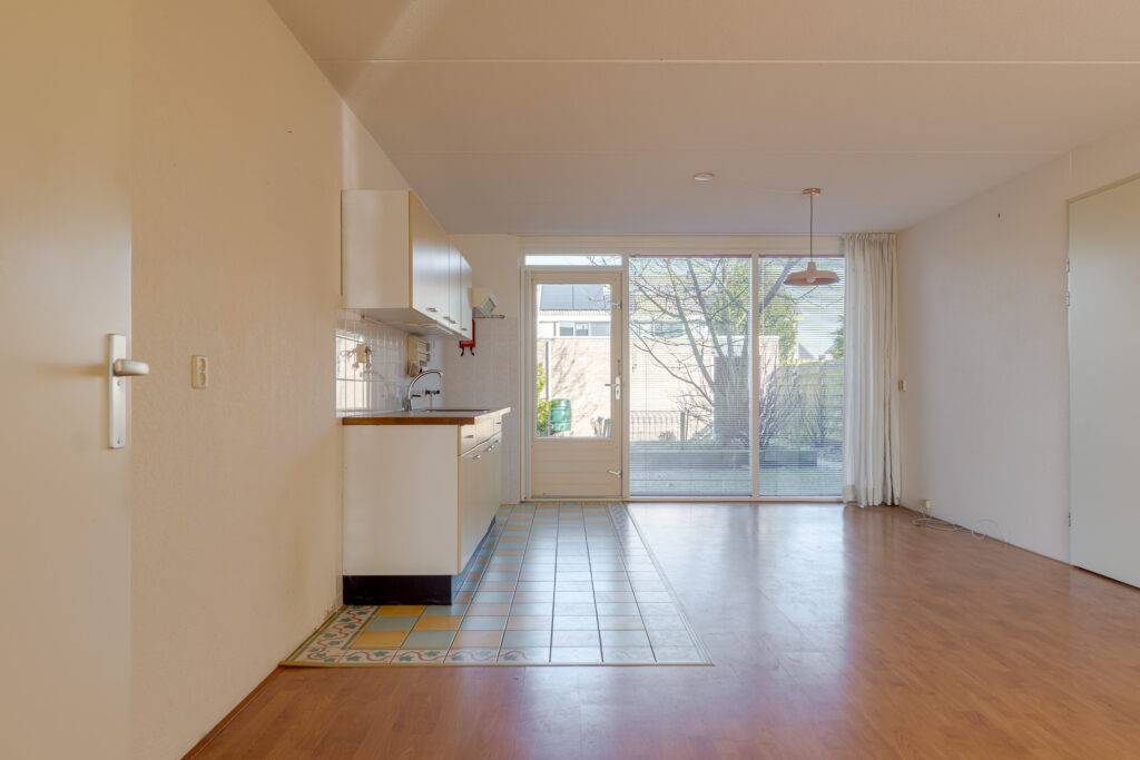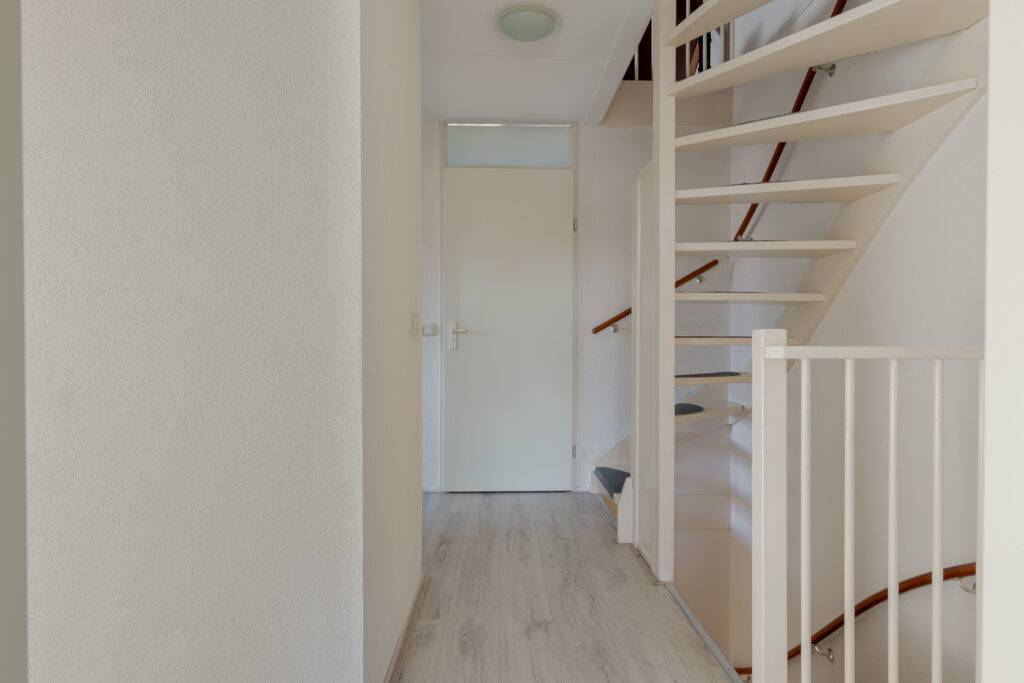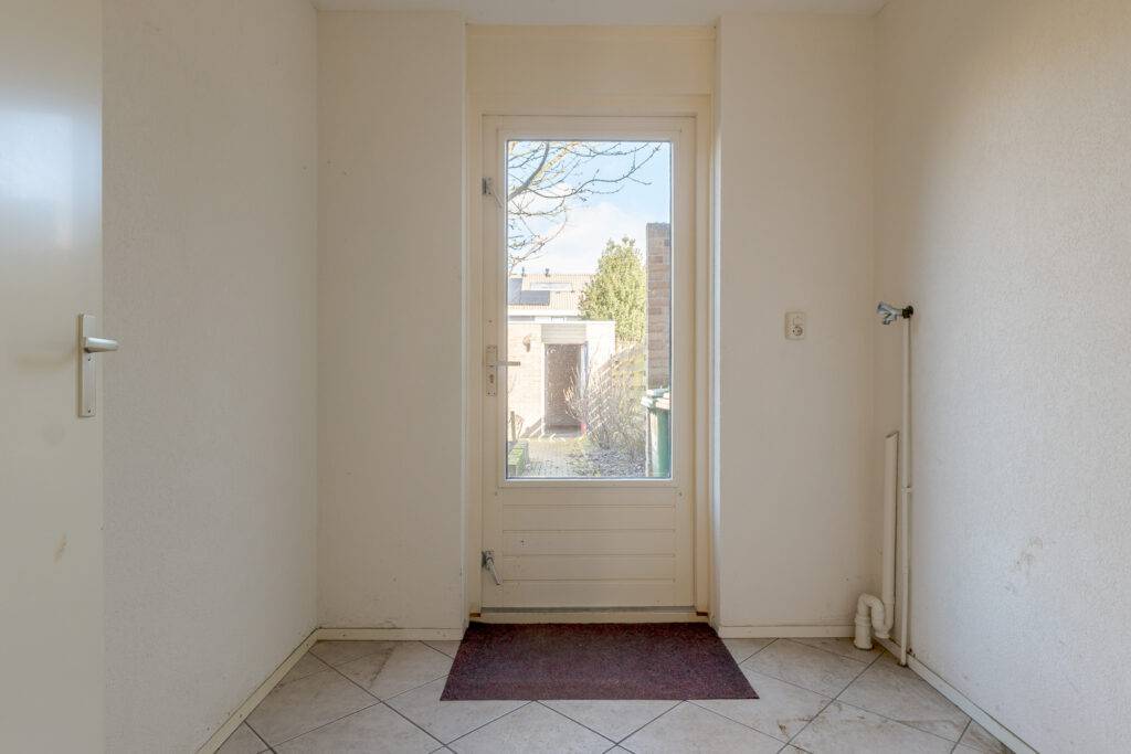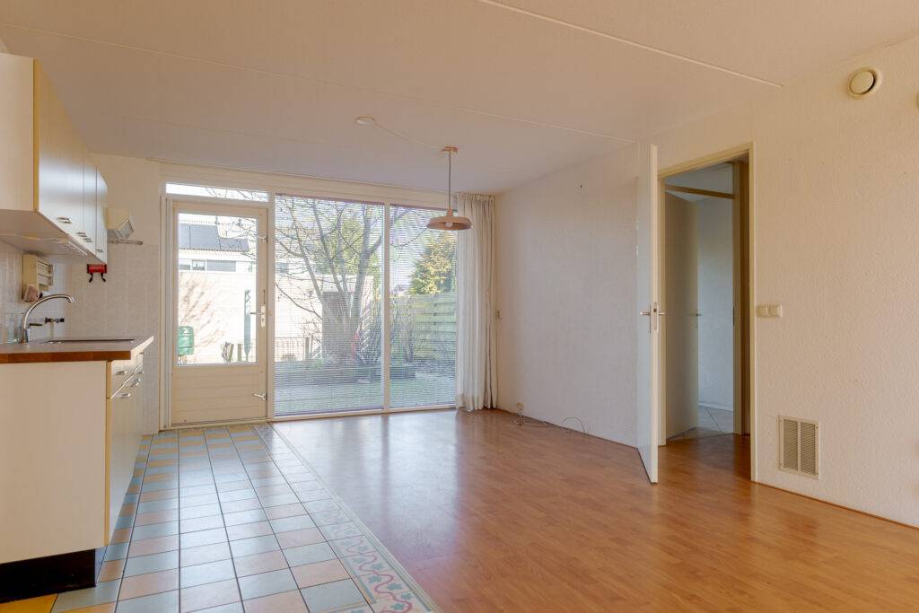 Indeling: overdekte entree, hal, woonkamer met open inbouwkeuken en tuindeur totaal 42 m², bijkeuken met witgoedaansluiting en buitendeur, tussenhal met toilet (wandcloset) en trapopgang naar de: