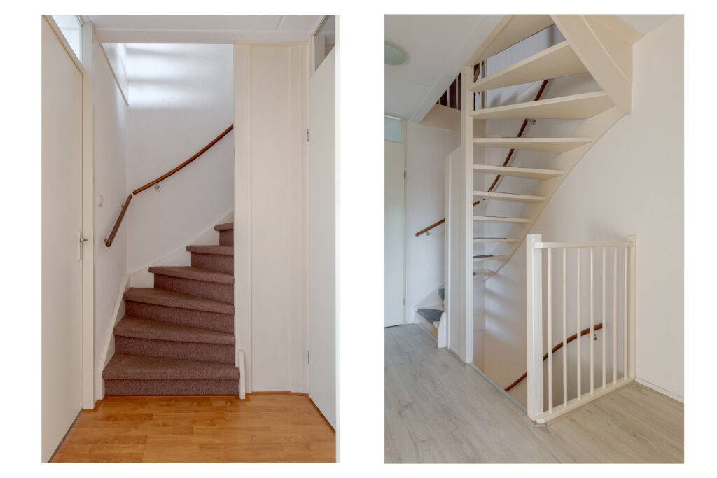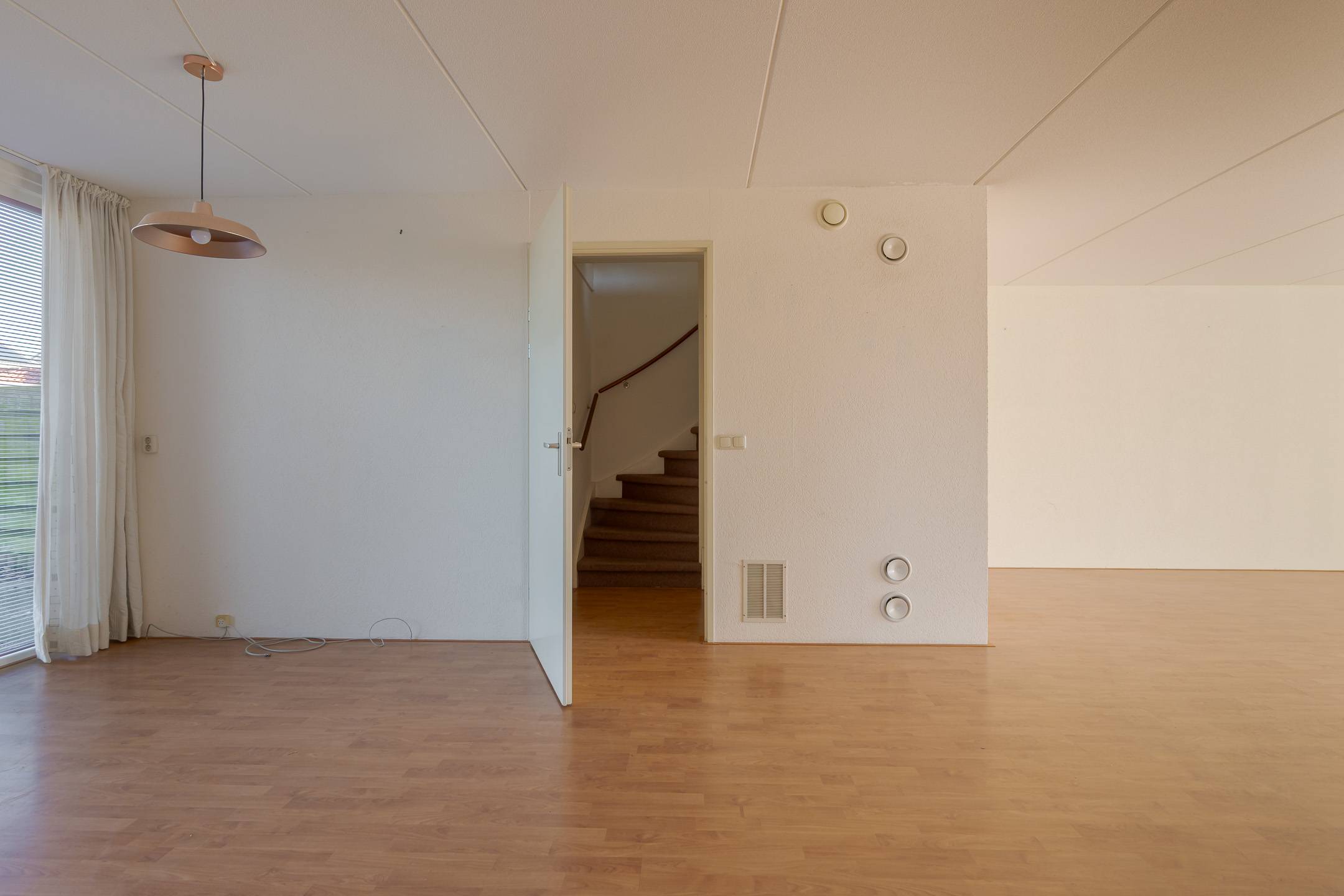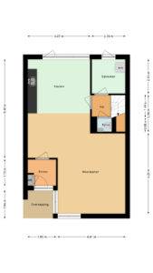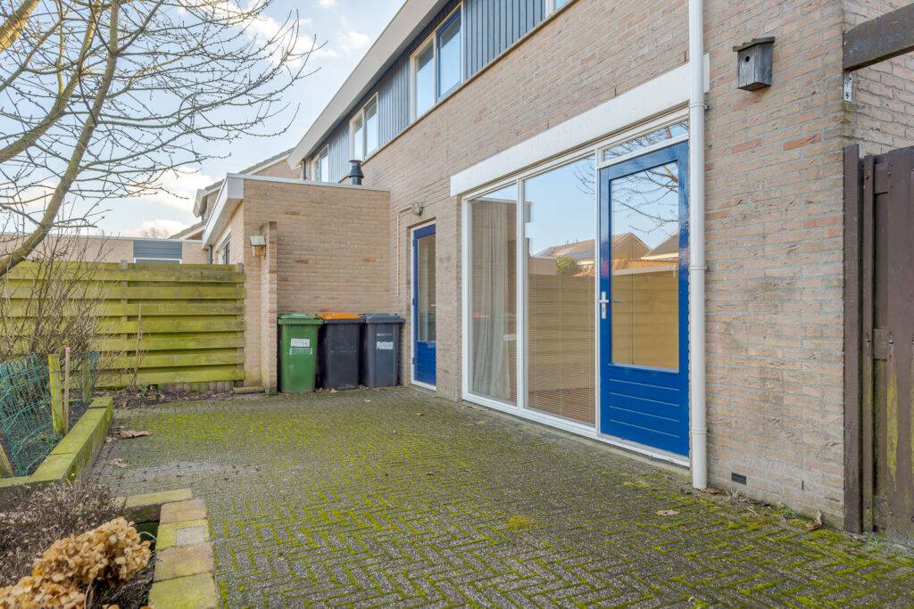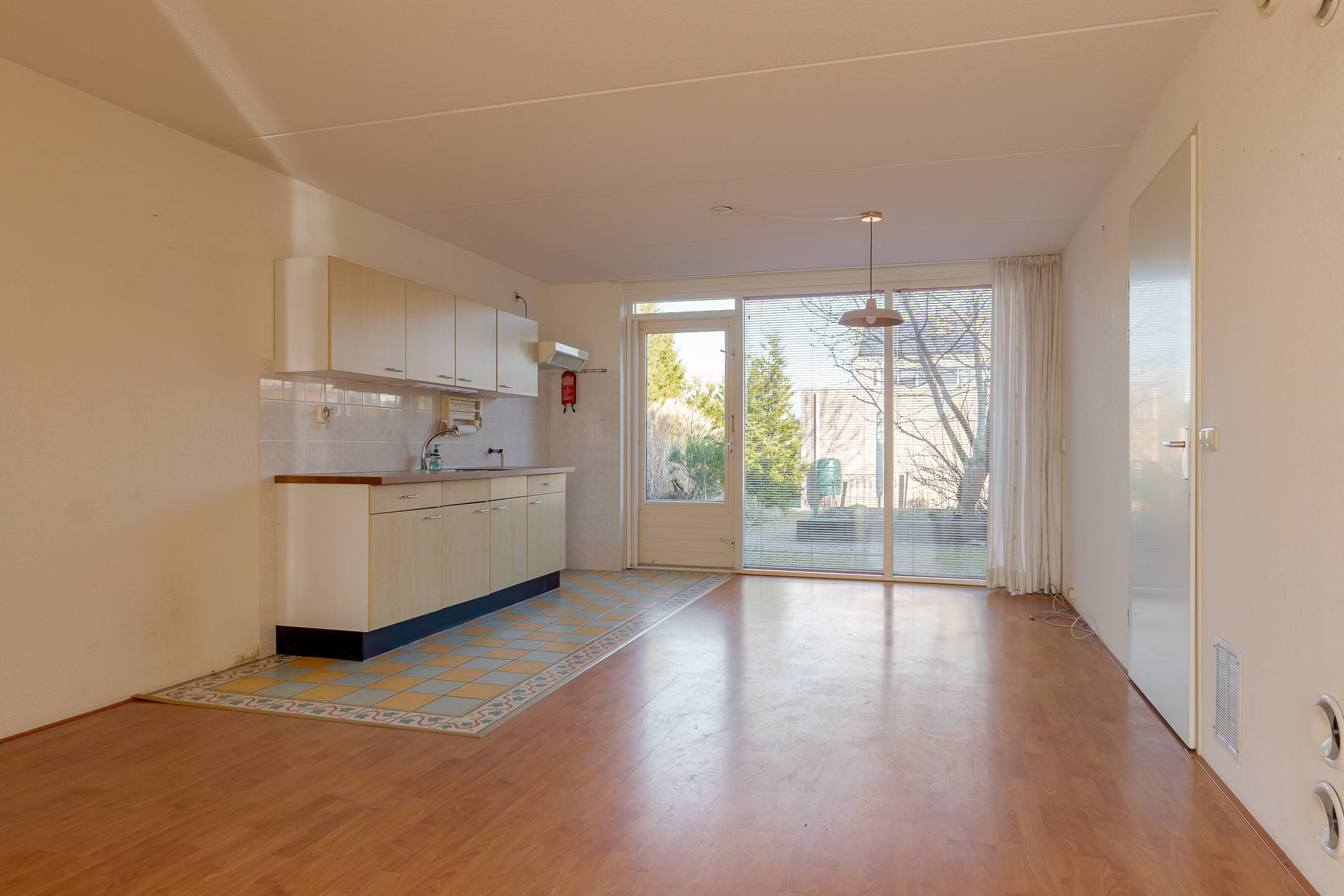 Indeling: overdekte entree, hal, woonkamer met open inbouwkeuken en tuindeur totaal 42 m², bijkeuken met witgoedaansluiting en buitendeur, tussenhal met toilet (wandcloset) en trapopgang naar de: