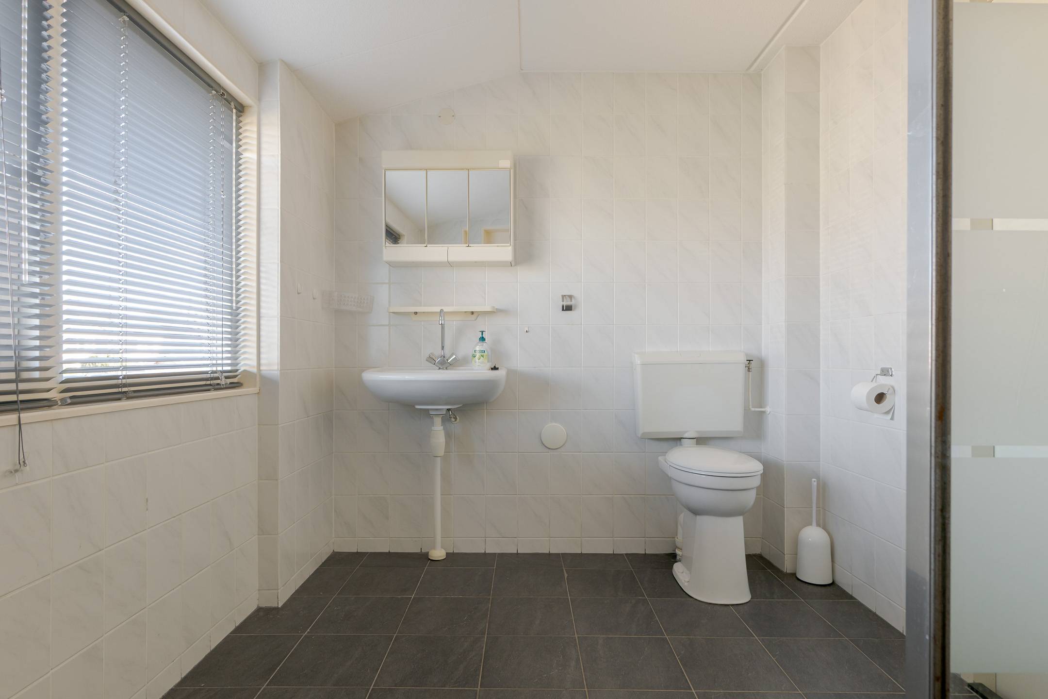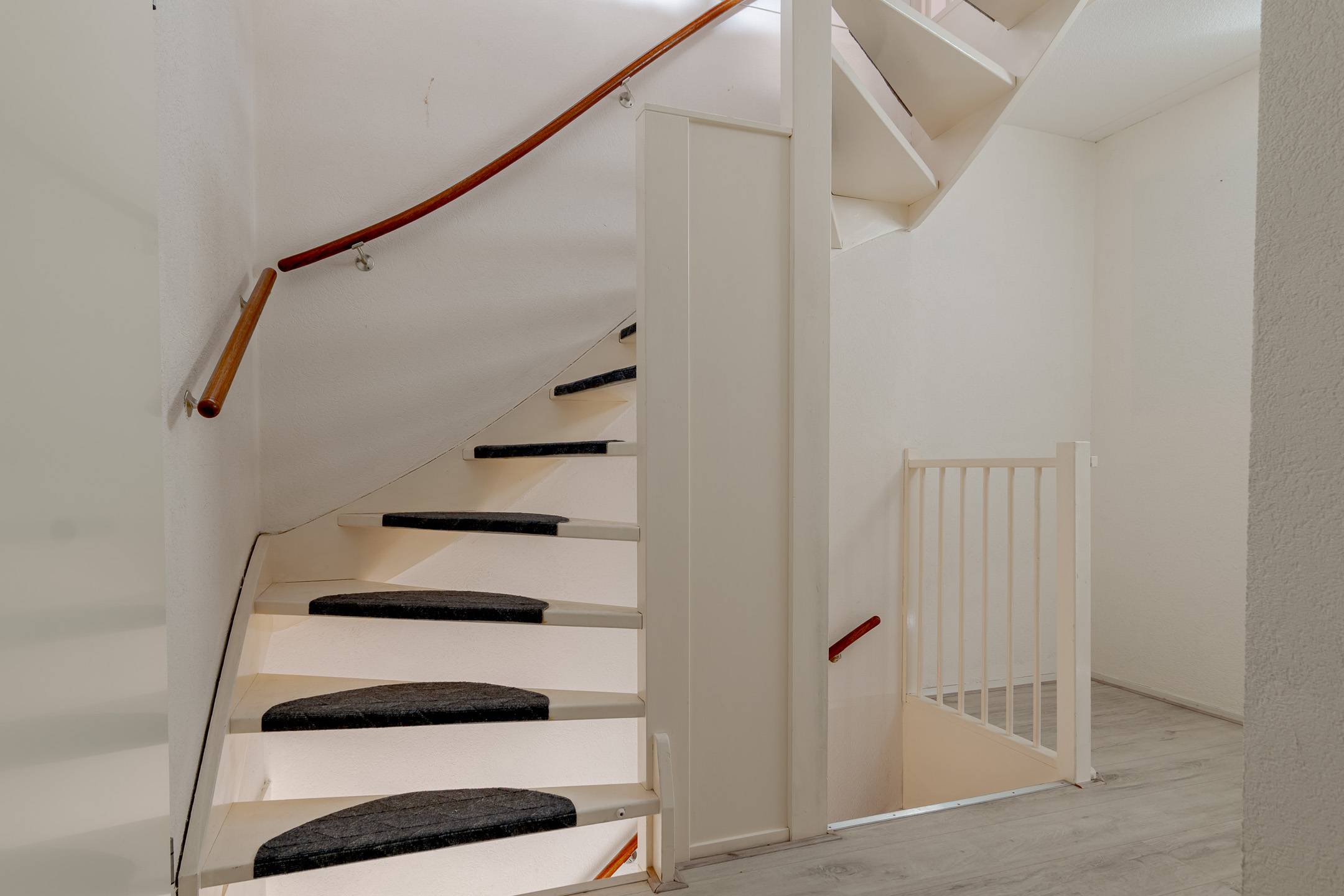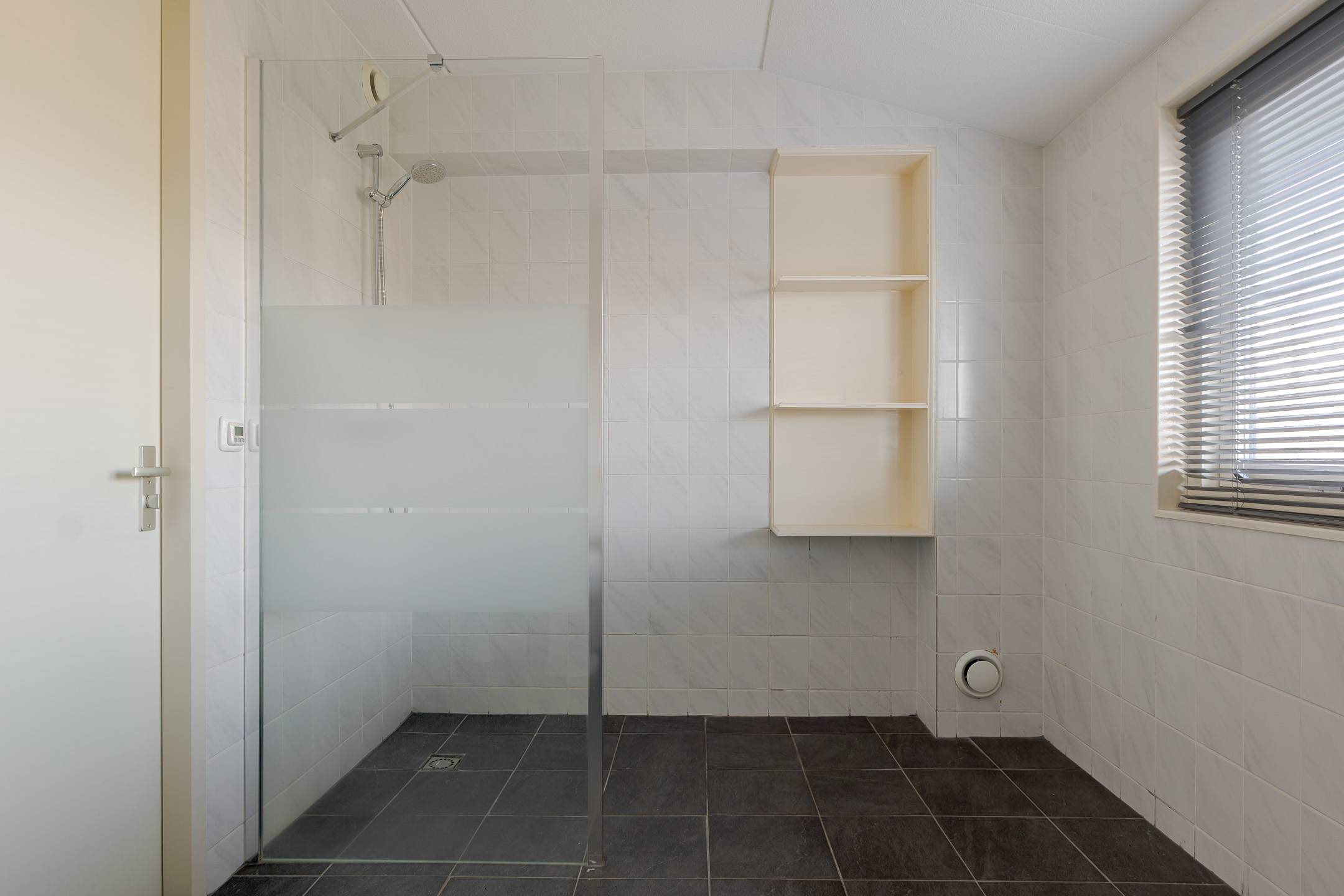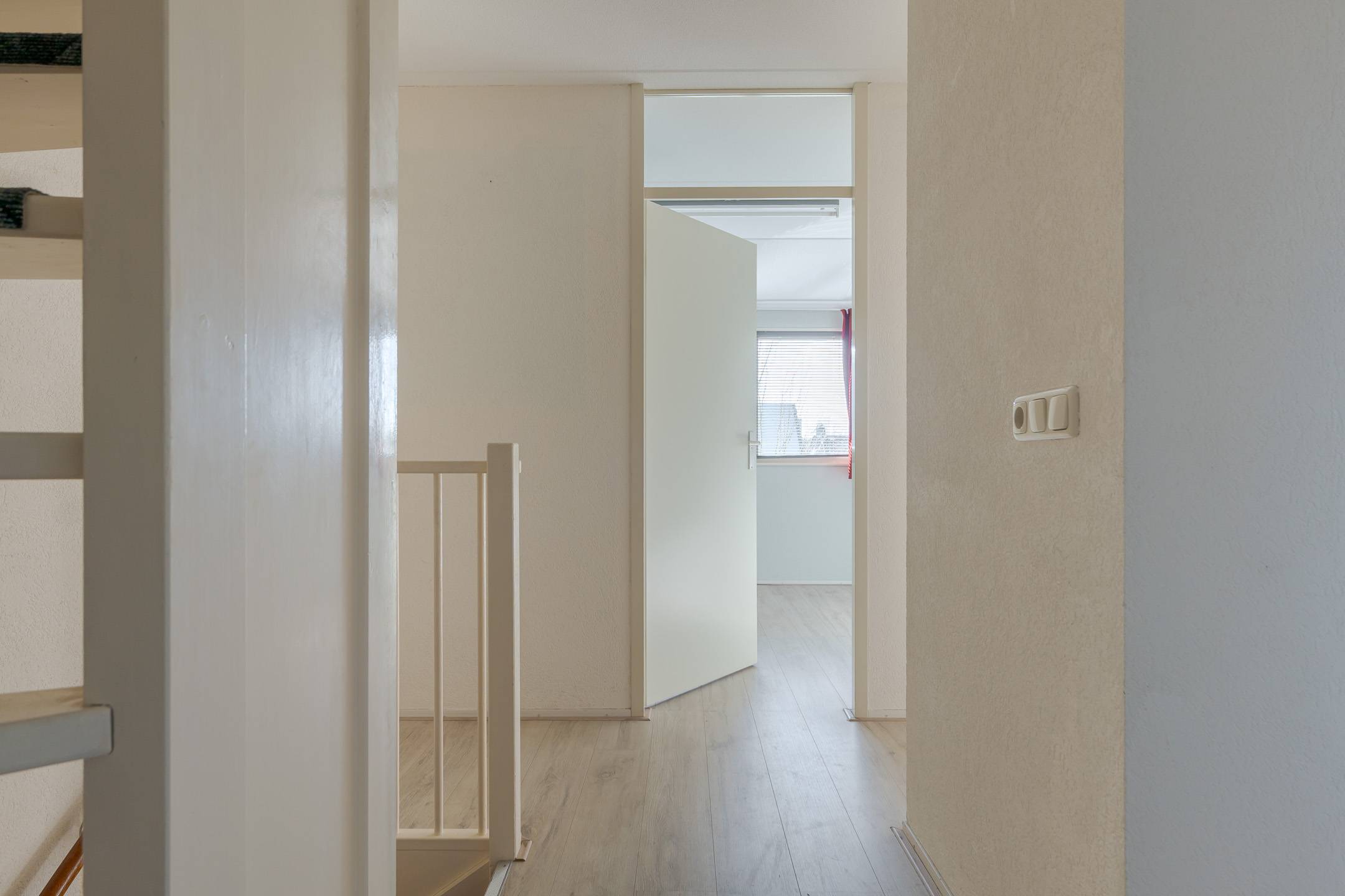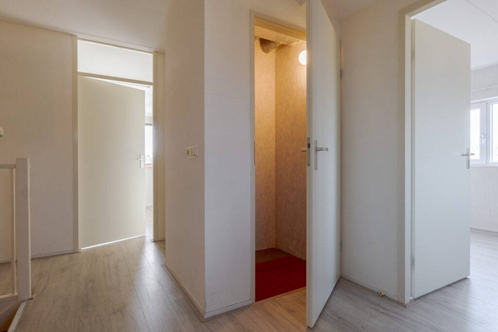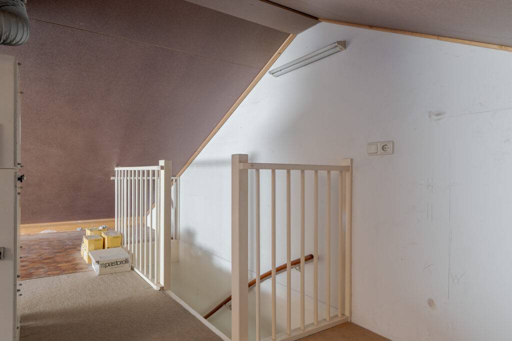 Verdieping: overloop met inloopkast, 3 slaapkamers, de badkamer is voorzien van een inloopdouche met scherm, wastafel en een 2e toilet (verhoogd), vaste trap naar de: