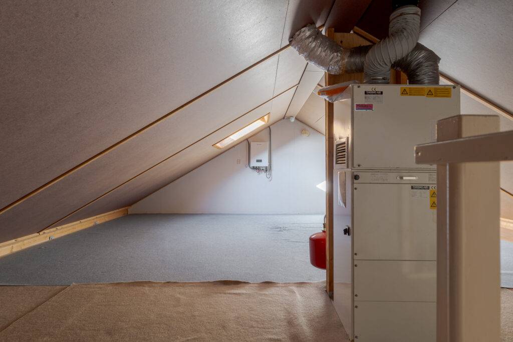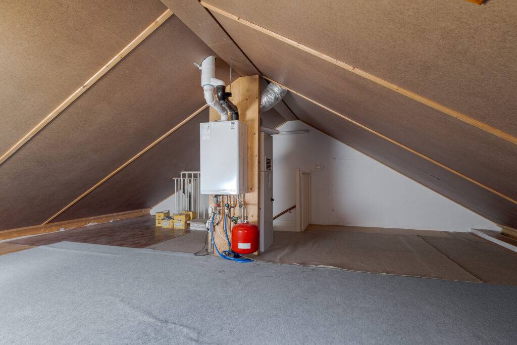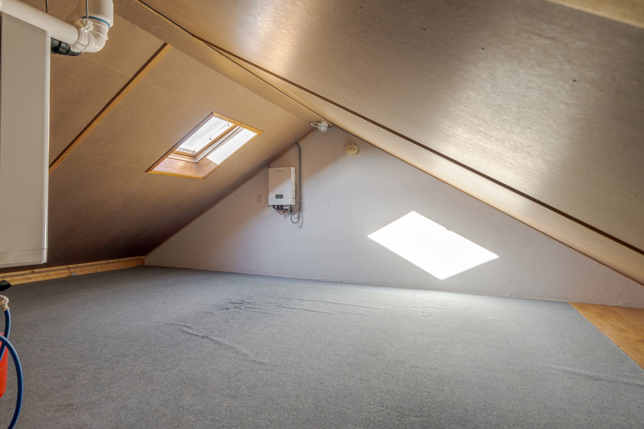 Zolder: bergruimte met dakvenster en opstelling CV-ketel en mechanisch ventilatiesysteem.