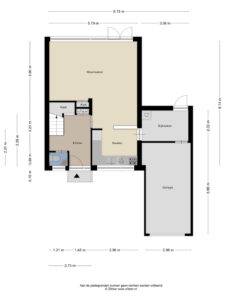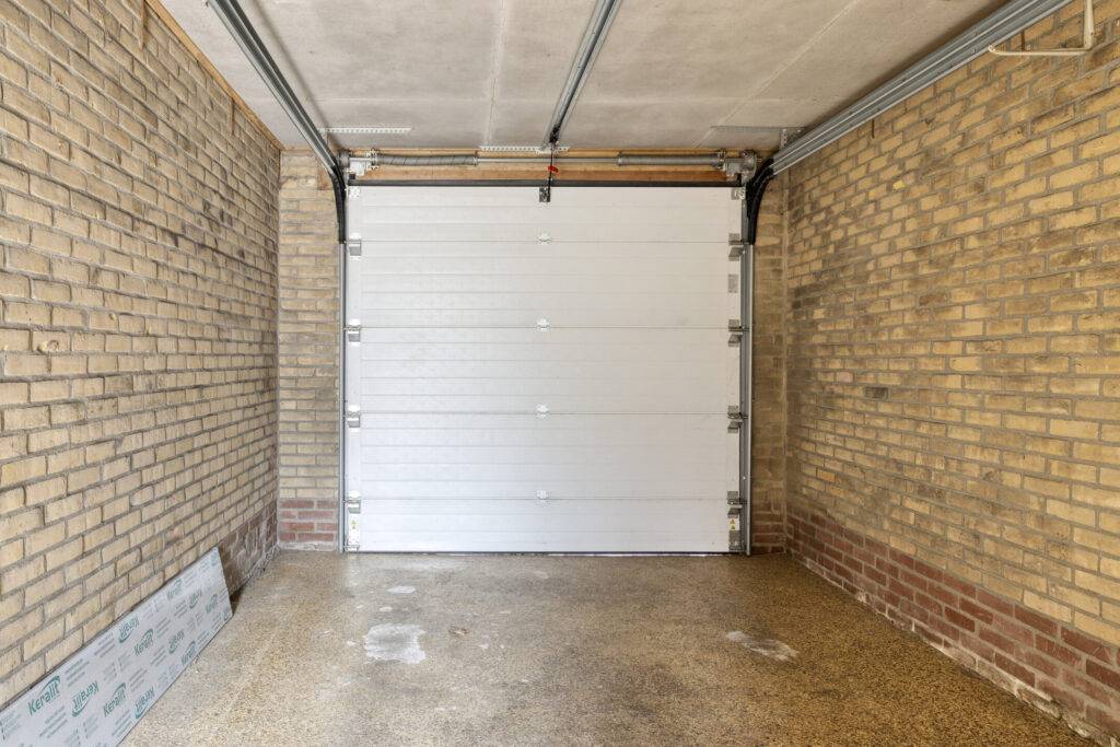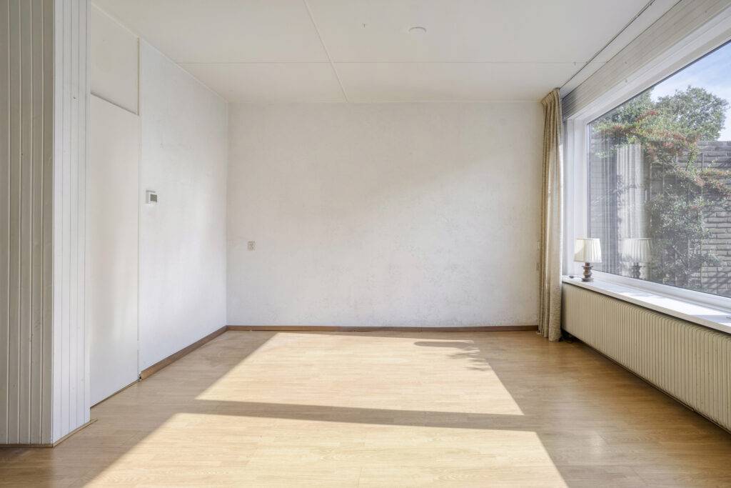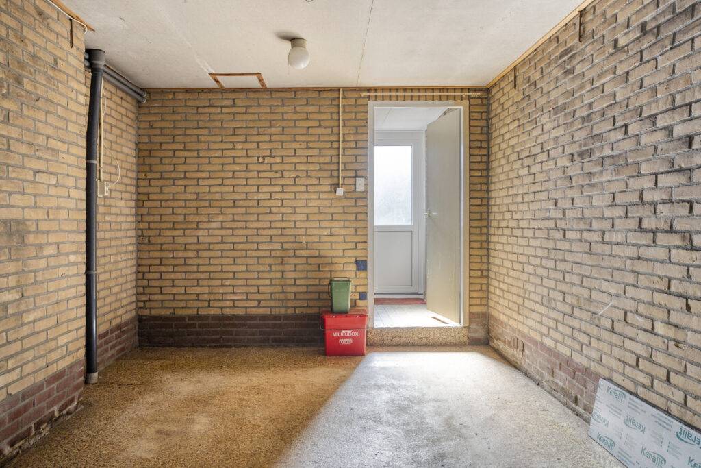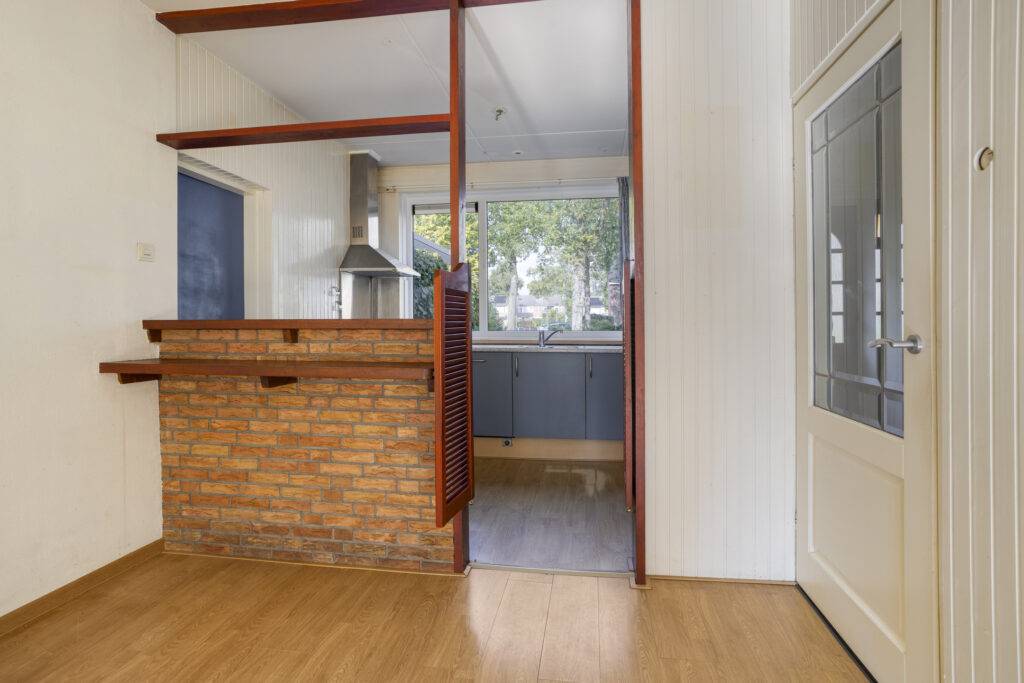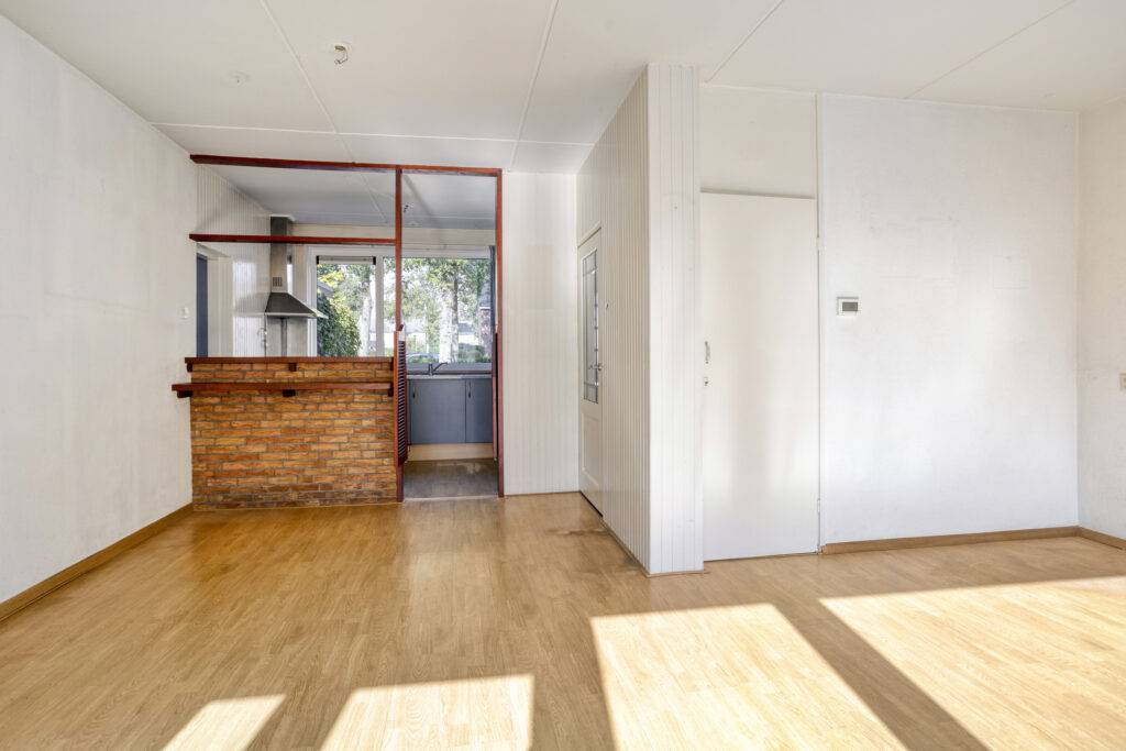 Indeling: hal met toilet en garderobekast, L-vormige woonkamer met tuindeuren, vaste kast en een halfopen keuken (samen 36 m², voorzien van laminaatvloer), vanuit de keuken toegang tot de bijkeuken met witgoedaansluiting en buitendeur, aansluitend de garage (18 m²) met elektrische sectionaaldeur.