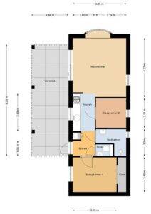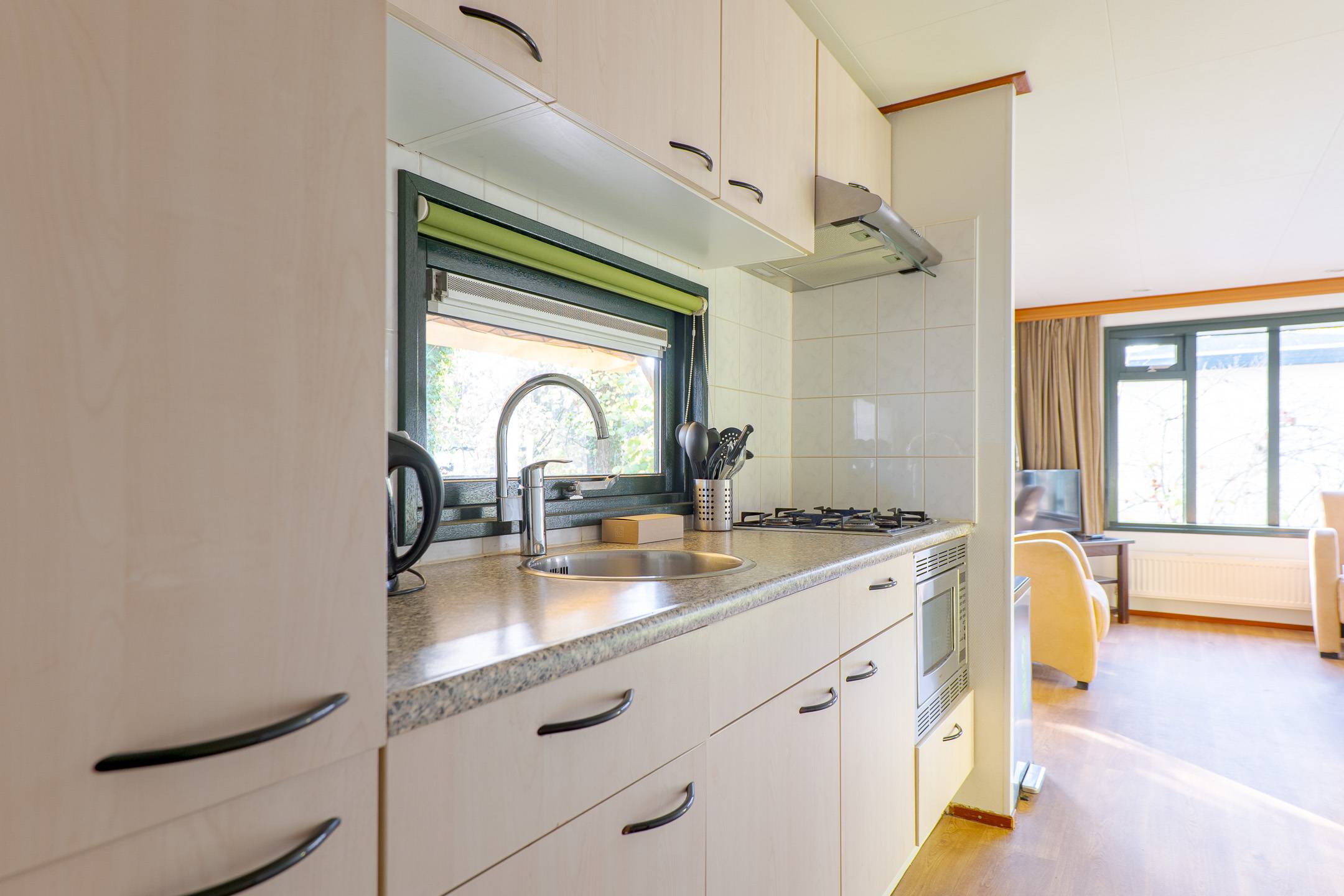 Indeling: entree, CV-kast, toilet, woonkamer met schuifpui naar de veranda en open keuken met inbouwapparatuur (afzuigkap, gaskookplaat, koelkast, combimagnetron en vaatwasser), 2 slaapkamers met ingebouwde kasten, badkamer voorzien van douchecabine en wastafel. De inventaris is bij de prijs inbegrepen.