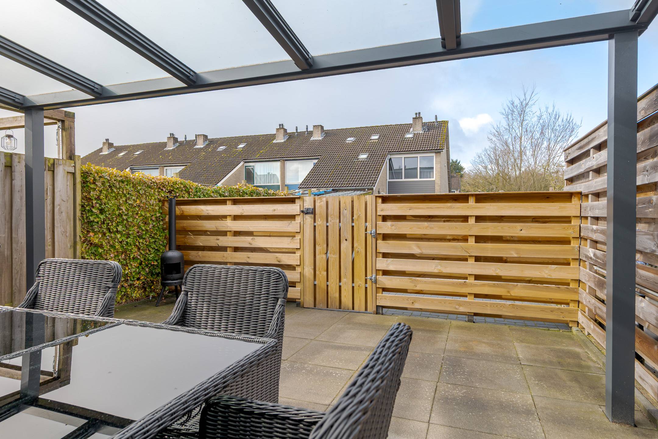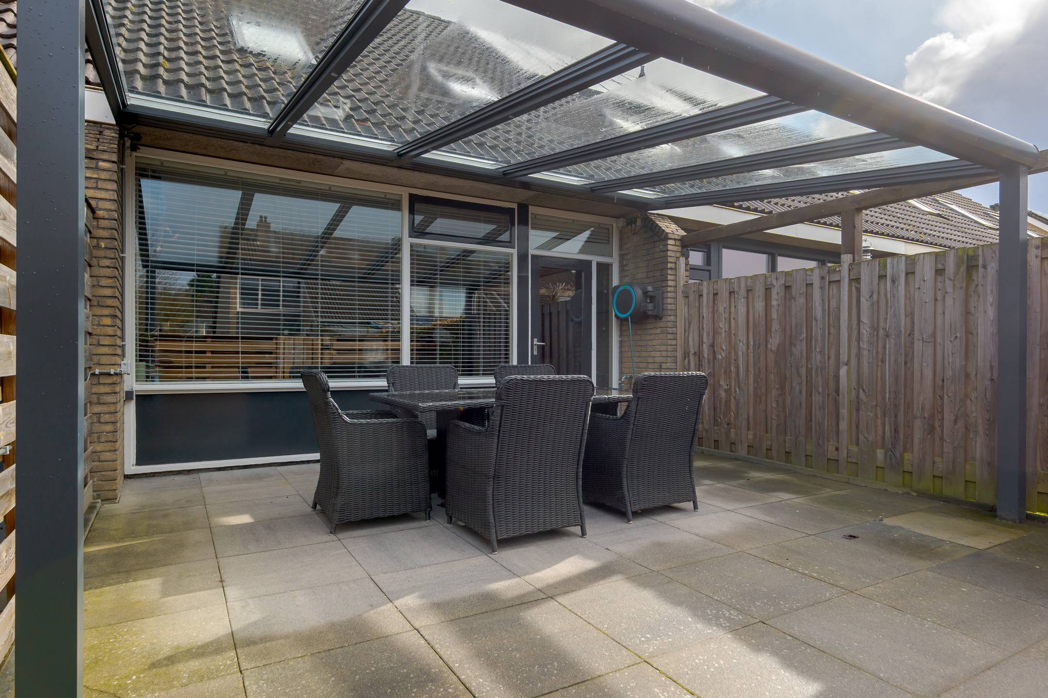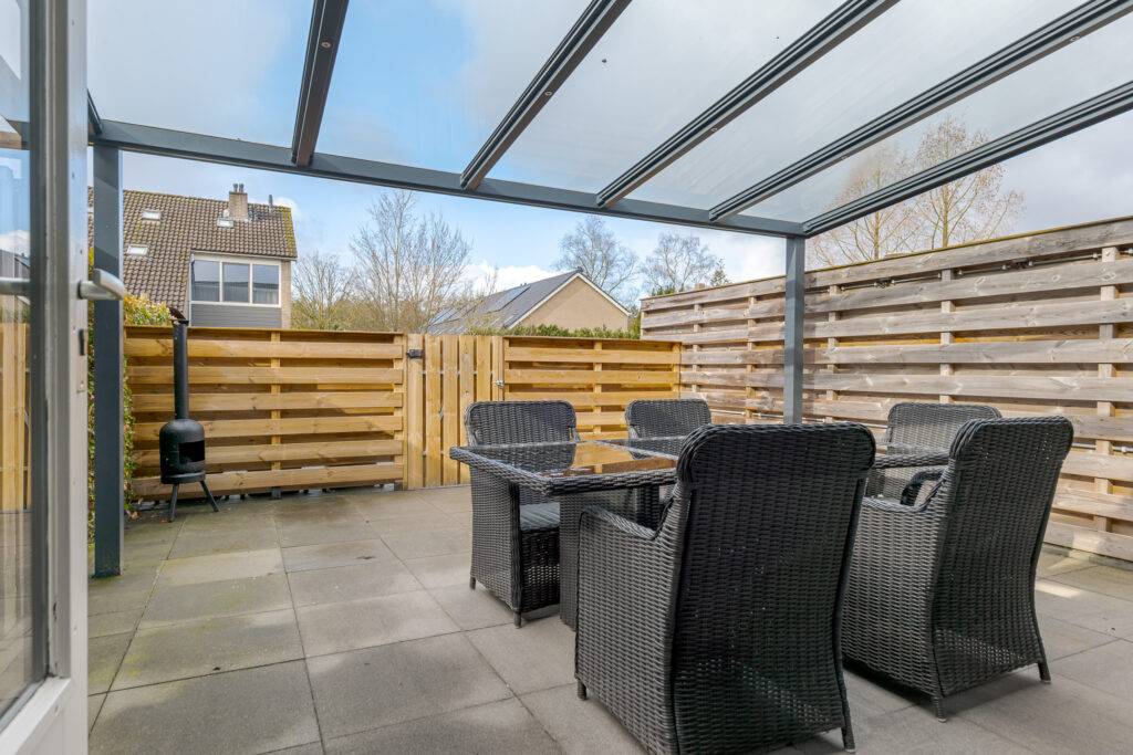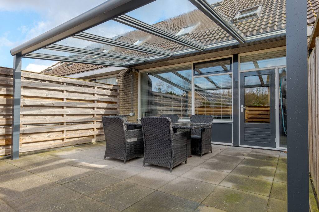 De achtertuin is op het zuidwesten georiënteerd en beschikt over een in 2025 geplaatste aluminium terrasoverkapping met glazen dak en ledverlichting. Heerlijk zitten is het hier! Daarnaast is er ruimte om een auto op eigen terrein te parkeren. Verder staat er een ruime houten berging, een praktische ruimte die is voorzien van gevelisolatie en dubbele beglazing; tevens is hier een urinoir aanwezig. De kavel heeft een oppervlakte van 176 m².