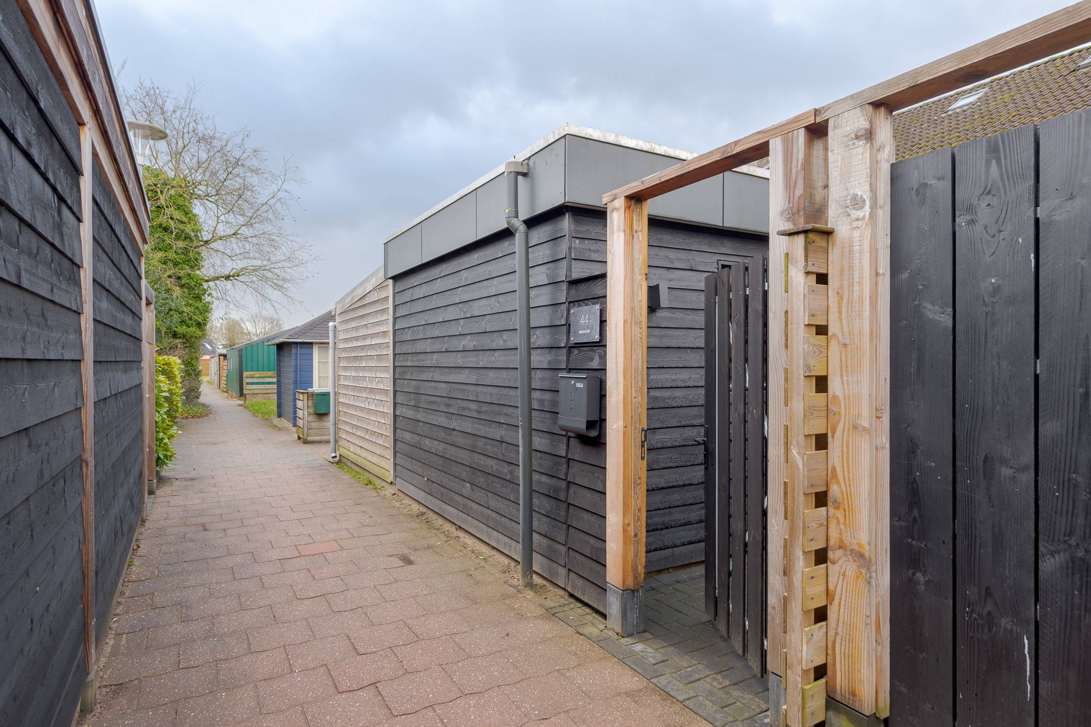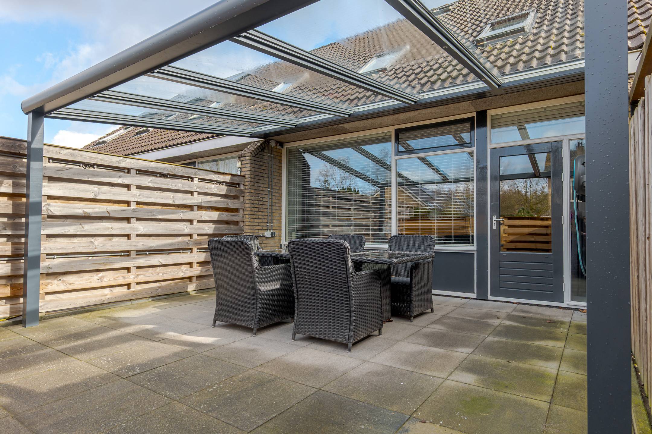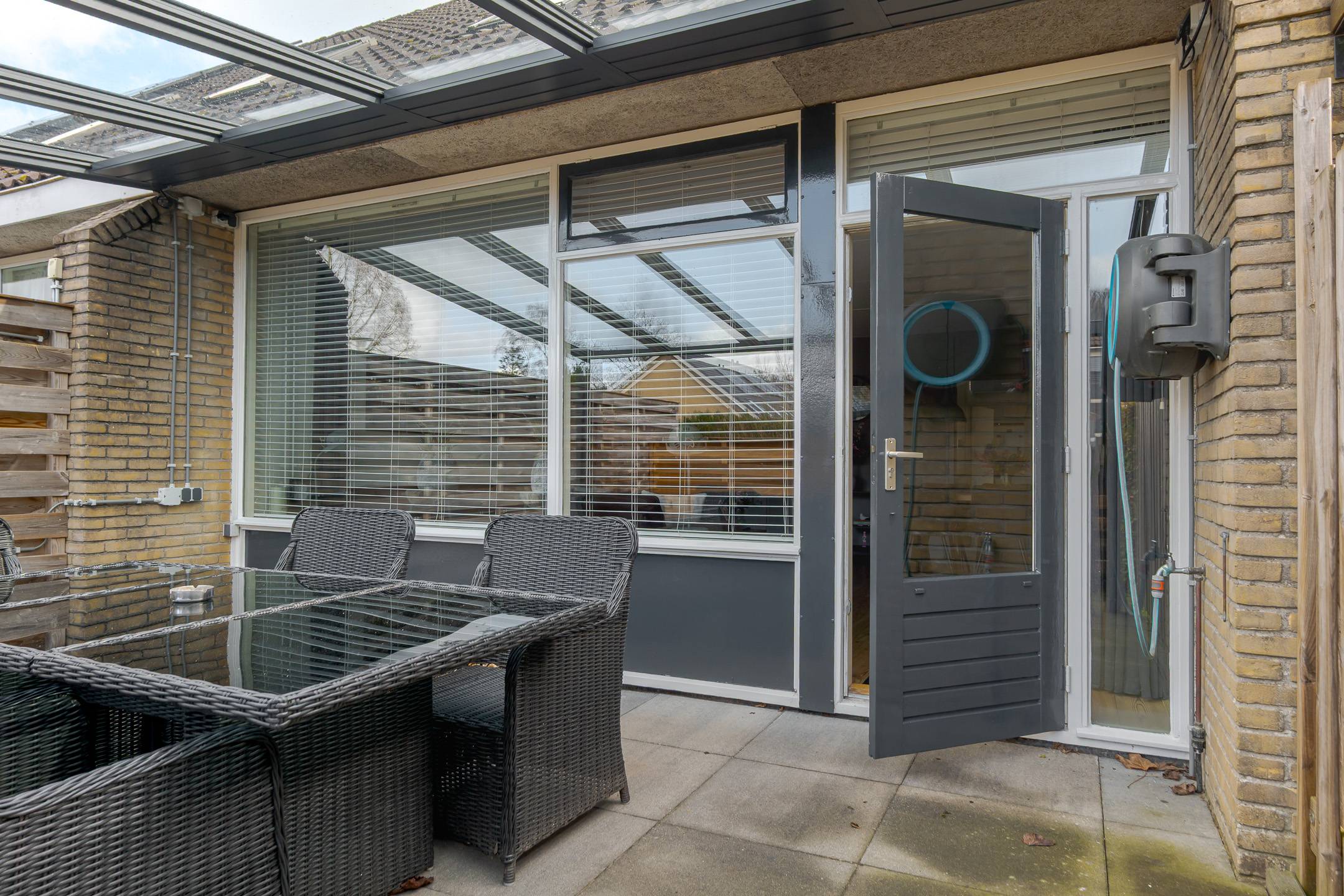 De achtertuin is op het zuidwesten georiënteerd en beschikt over een in 2025 geplaatste aluminium terrasoverkapping met glazen dak en ledverlichting. Heerlijk zitten is het hier! Daarnaast is er ruimte om een auto op eigen terrein te parkeren. Verder staat er een ruime houten berging, een praktische ruimte die is voorzien van gevelisolatie en dubbele beglazing; tevens is hier een urinoir aanwezig. De kavel heeft een oppervlakte van 176 m².