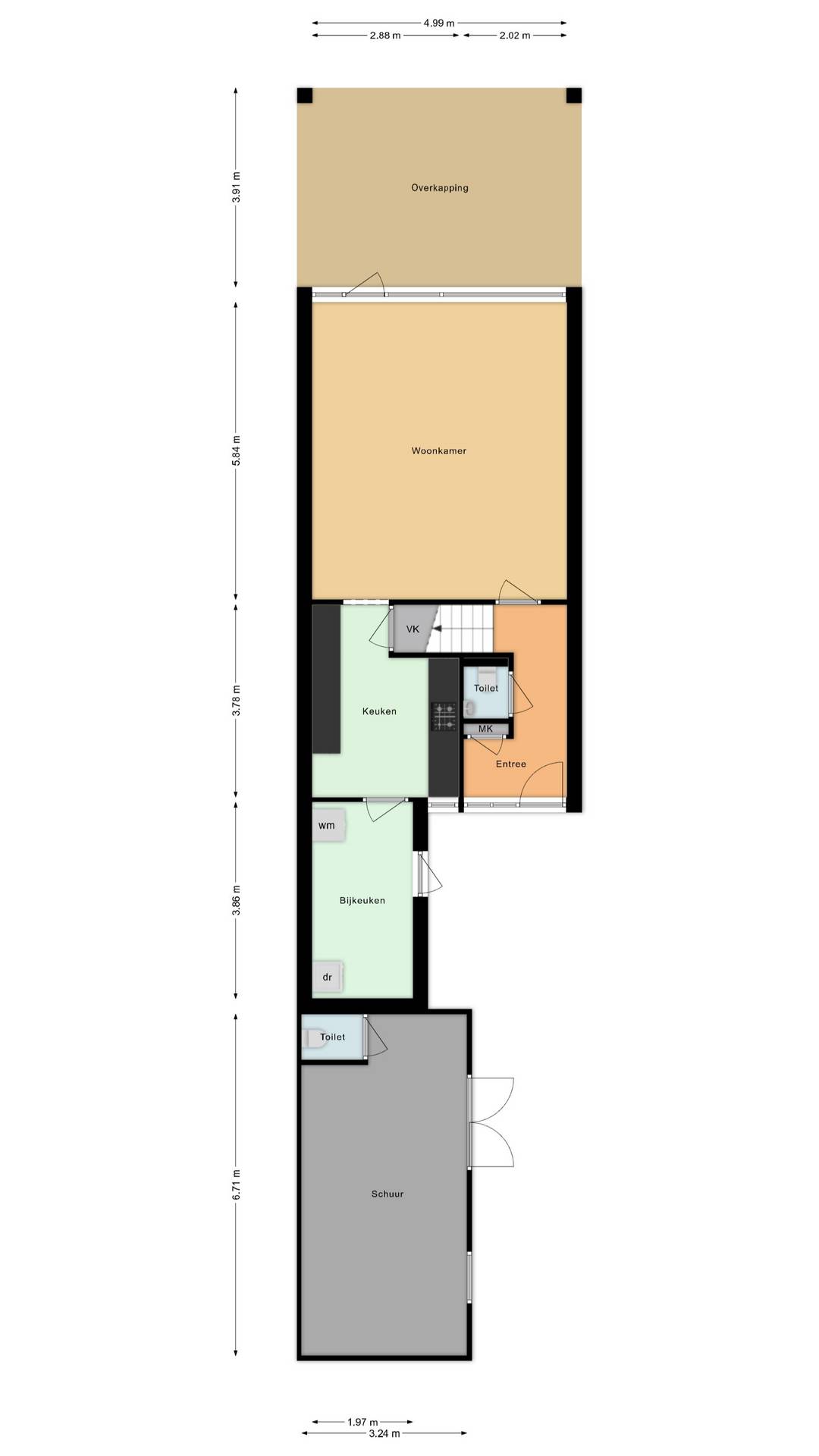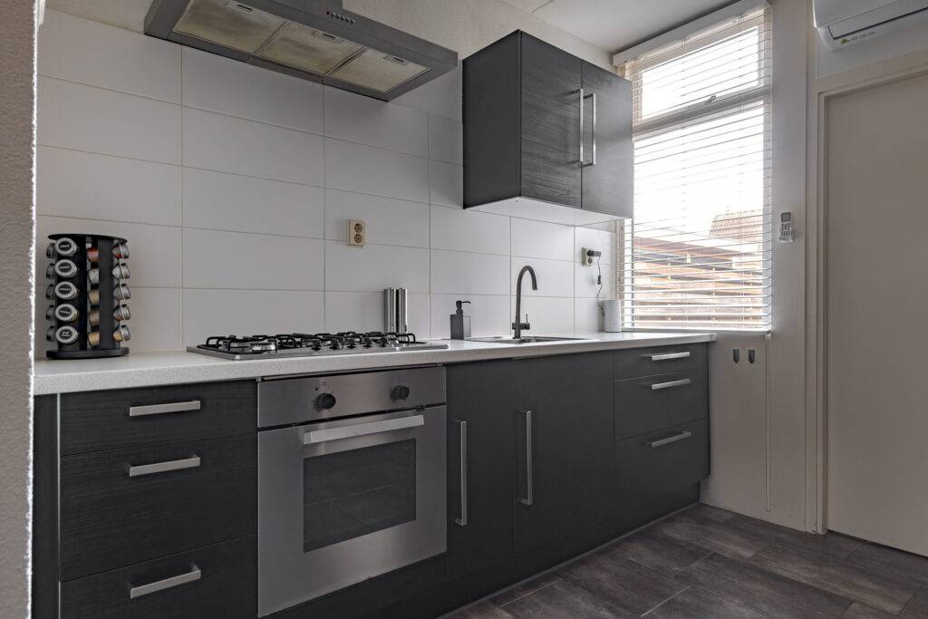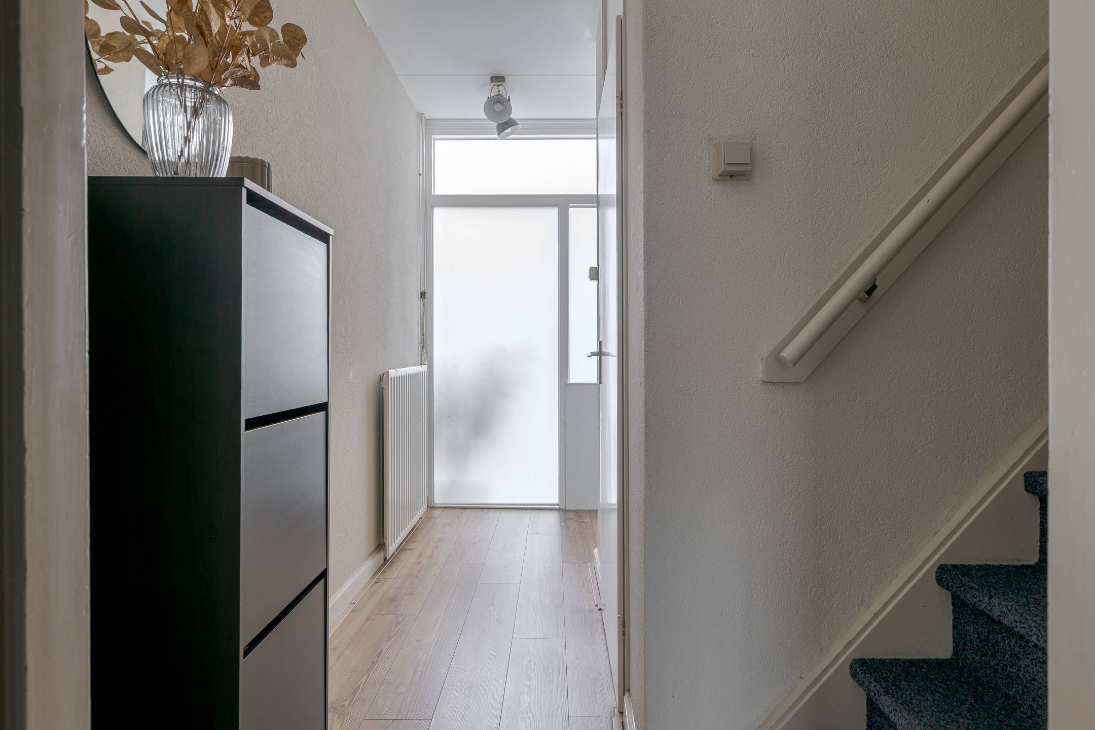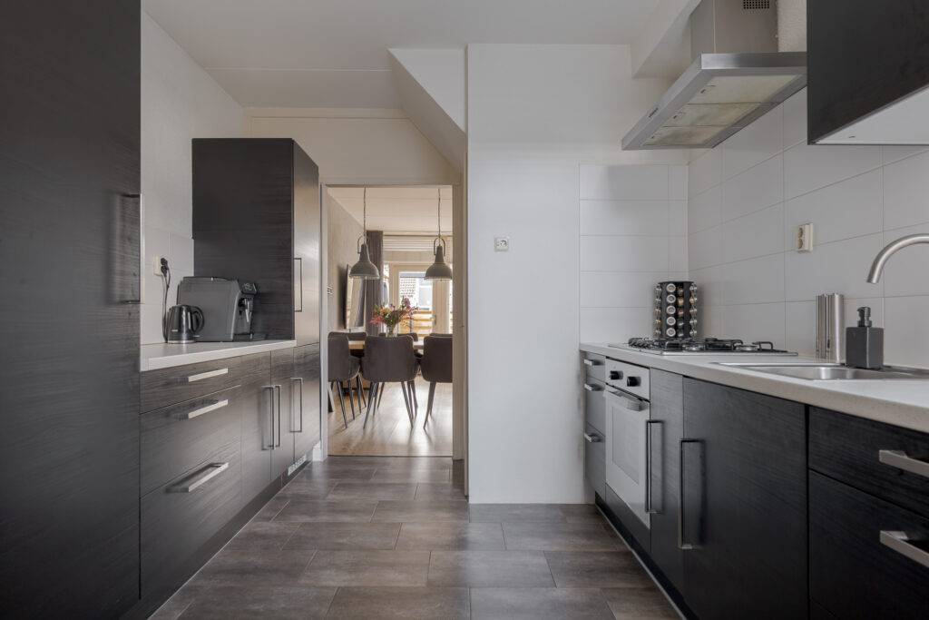 Indeling: via de bijkeuken (met witgoedaansluiting) komt u binnen, de tuingerichte woonkamer is voorzien van een laminaatvloer en een buitendeur naar de achtertuin, de keuken beschikt over inbouwapparatuur (een afzuigkap, gaskookplaat, oven en koel-/vriescombinatie), vanuit de hal met toilet en trapopgang bereikt u de: