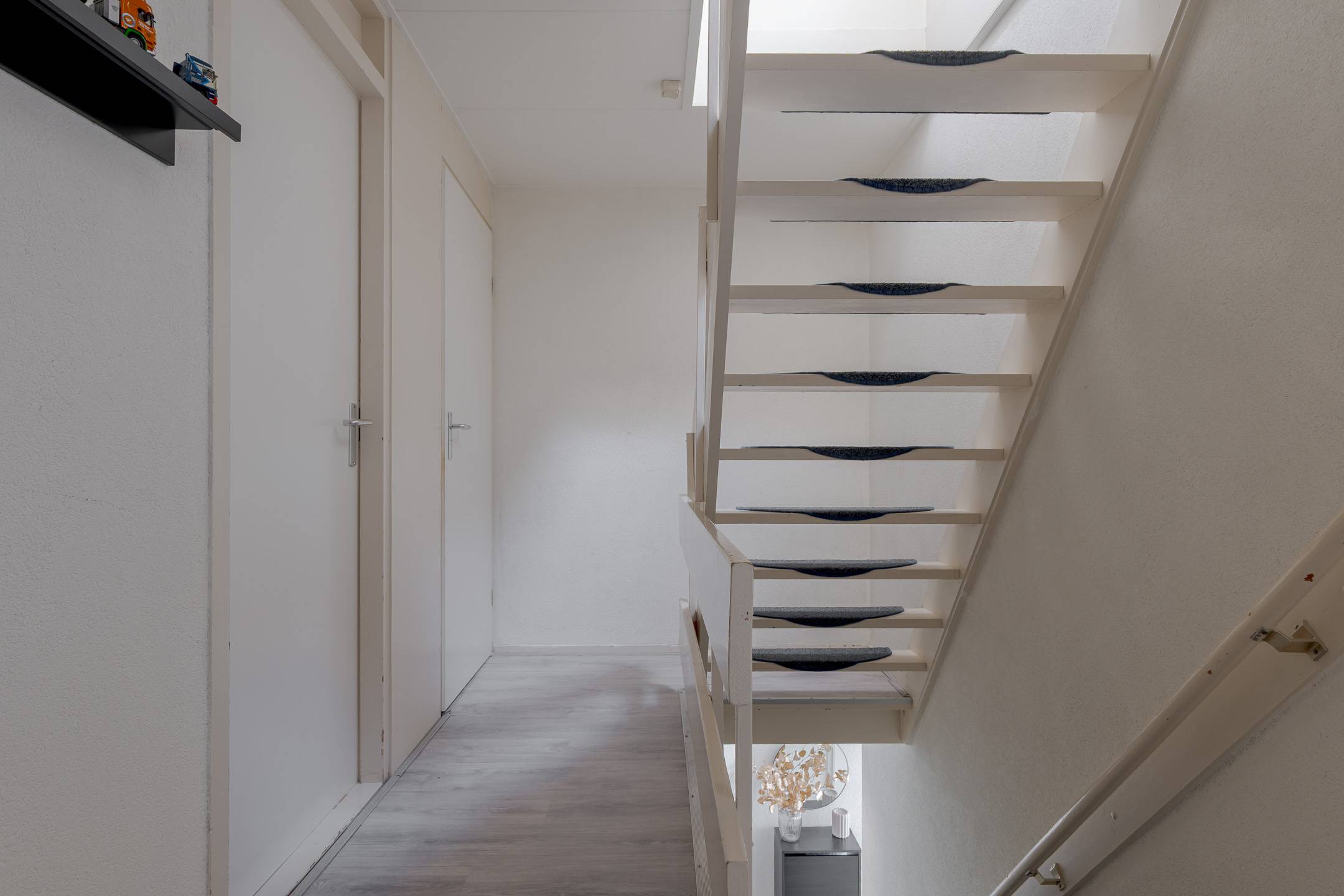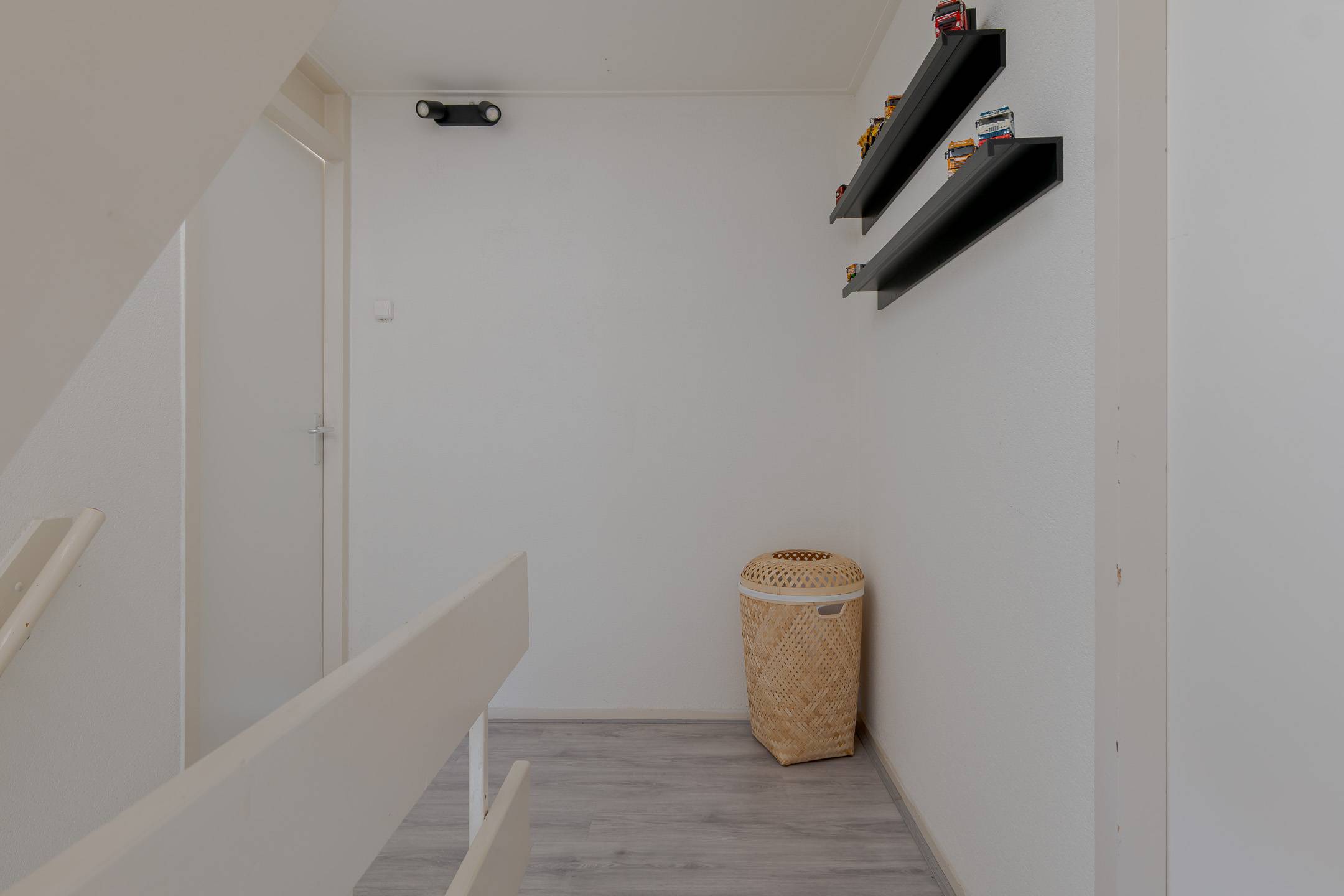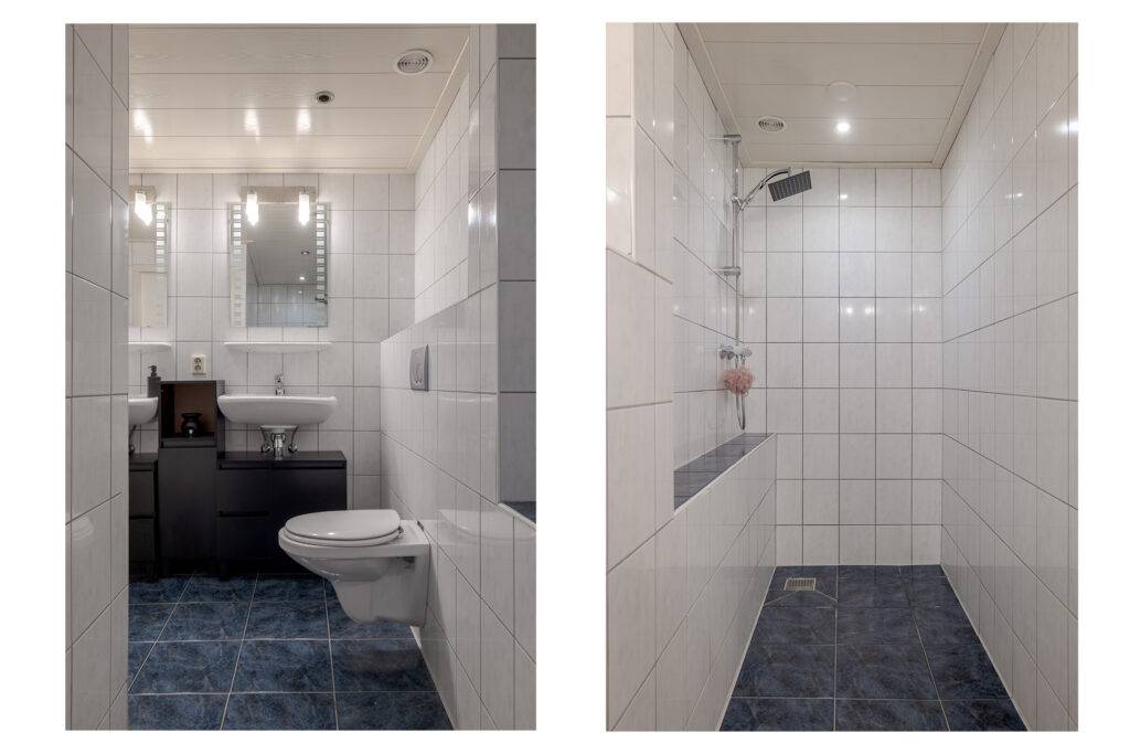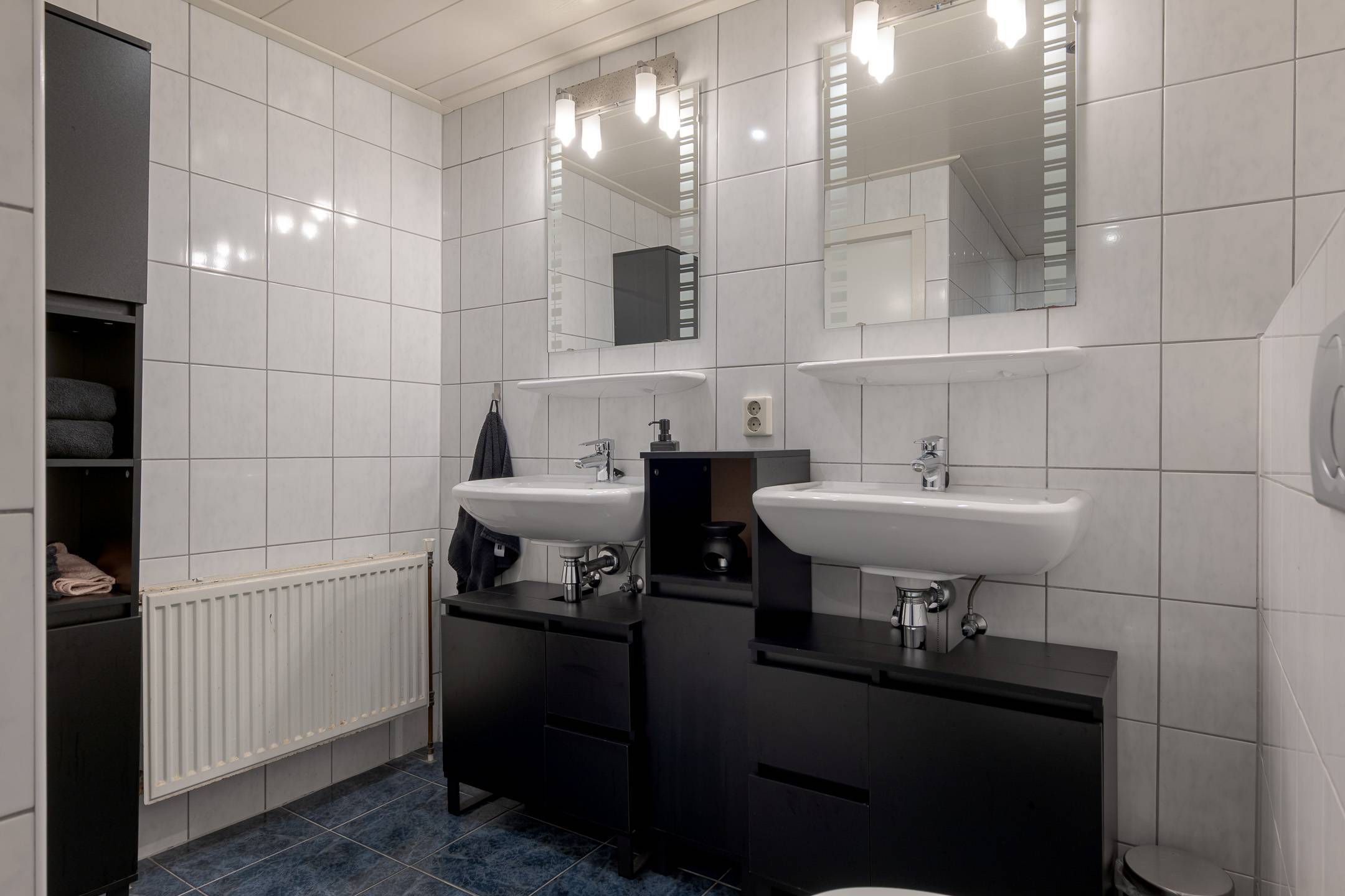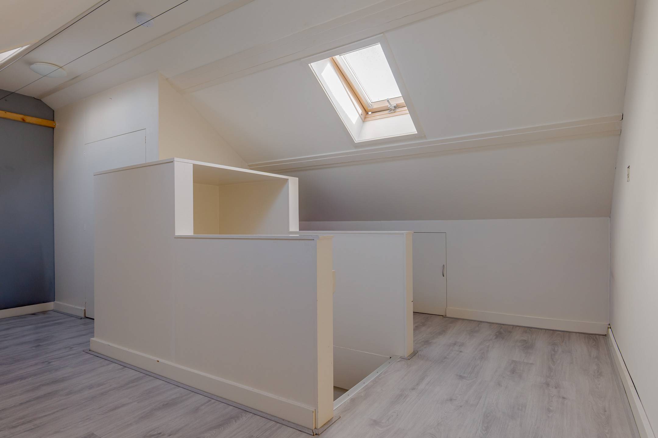 1e verdieping: overloop, 2 slaapkamers (één met inloopkast en rolluik en één met twee dakvensters en een werkhoek), de badkamer is voorzien van een inloopdouche, wastafelmeubel en tweede toilet. Via een vaste trap komt u op de: