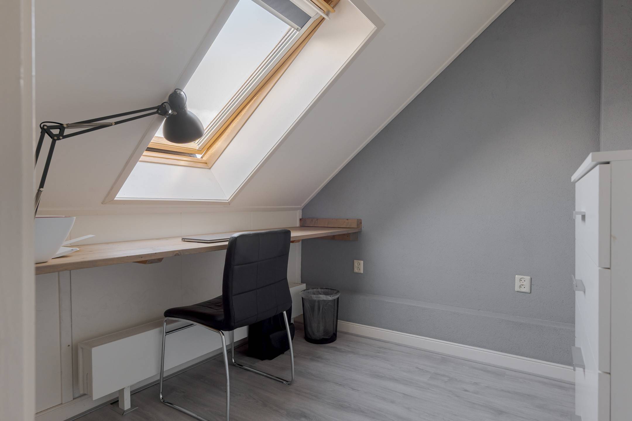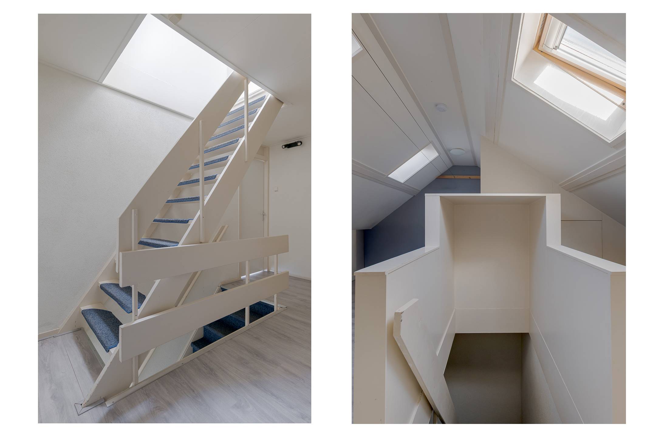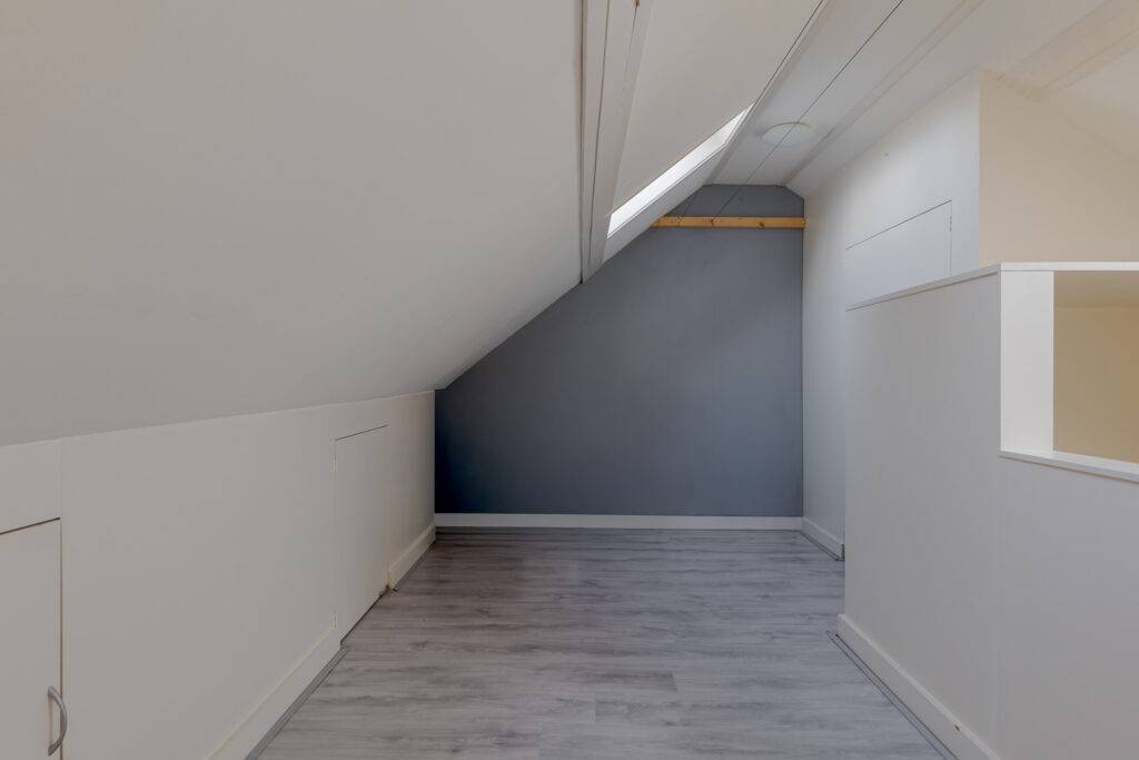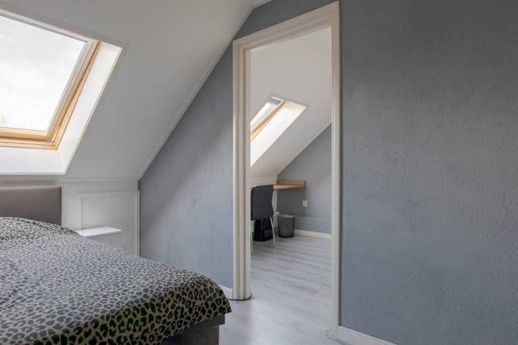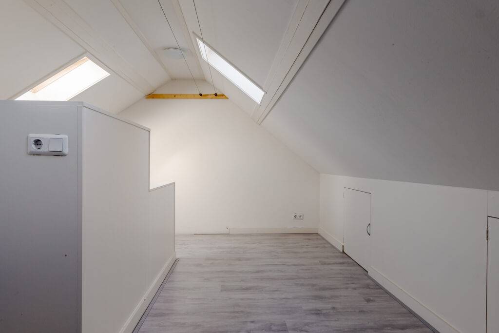 2e verdieping: zolderkamer met dakramen en CV-ruimte, met extra bergruimte achter de knieschotten.