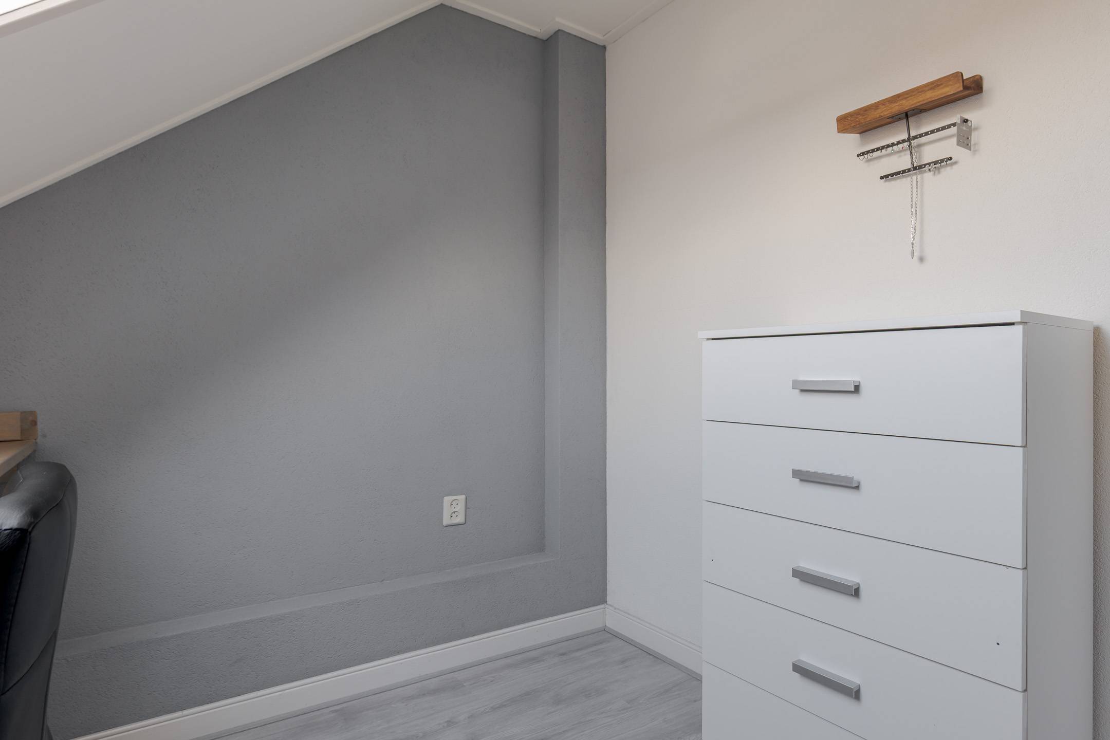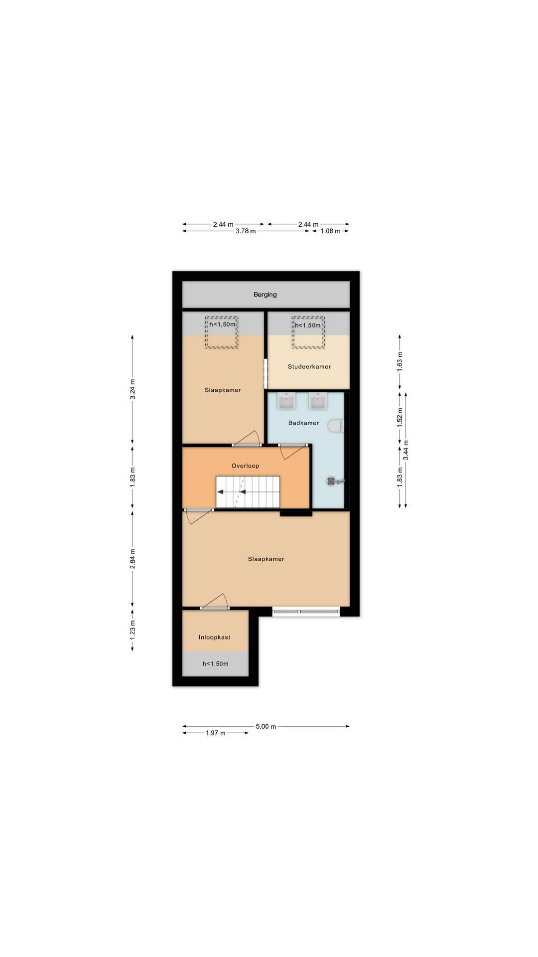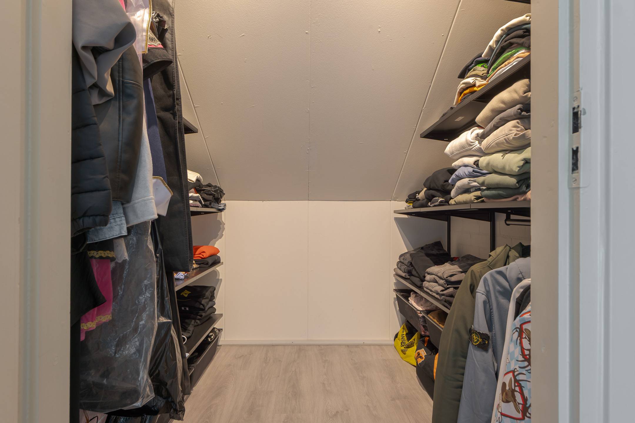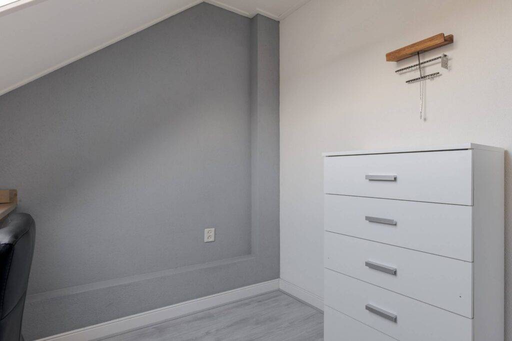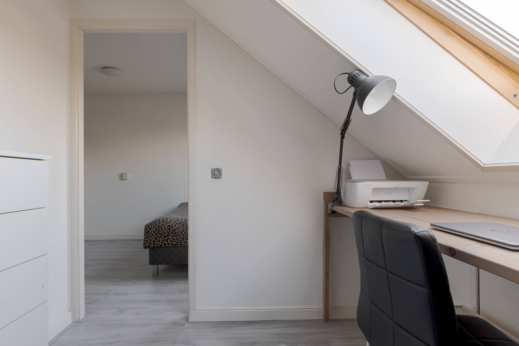 2e verdieping: zolderkamer met dakramen en CV-ruimte, met extra bergruimte achter de knieschotten.